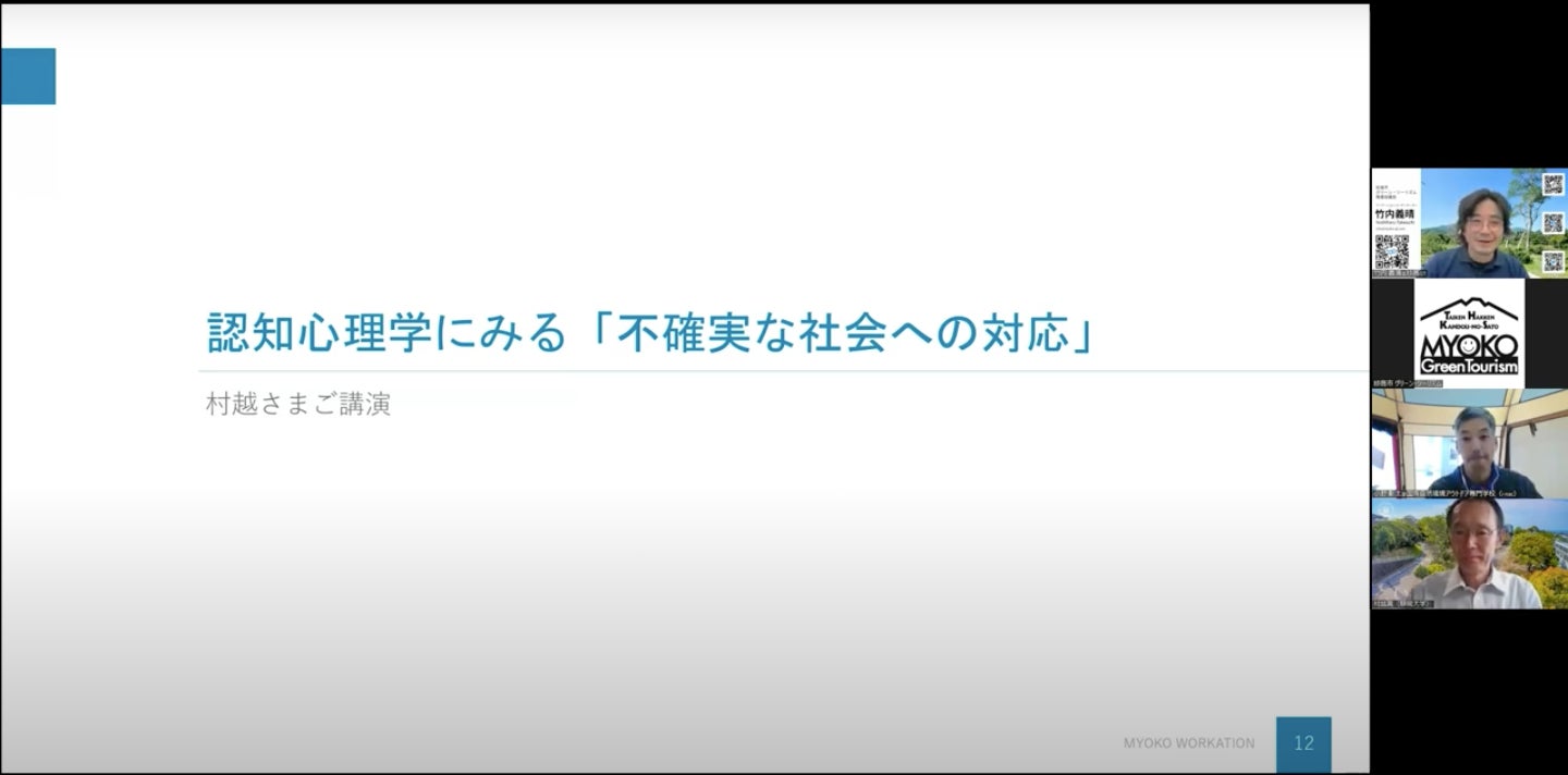 ウェビナーでは始め、主催者である妙高ワーケーションセンターの竹内義晴氏から、同センターで展開されている企業研修型のラーニングワーケーションについて案内がありました。その後、今回のイベントの背景ということで、ビジネス社会でもリスク含みの時代が到来し、変化やリスクへの対応力を個々人で身につけていく必要性について語られました。