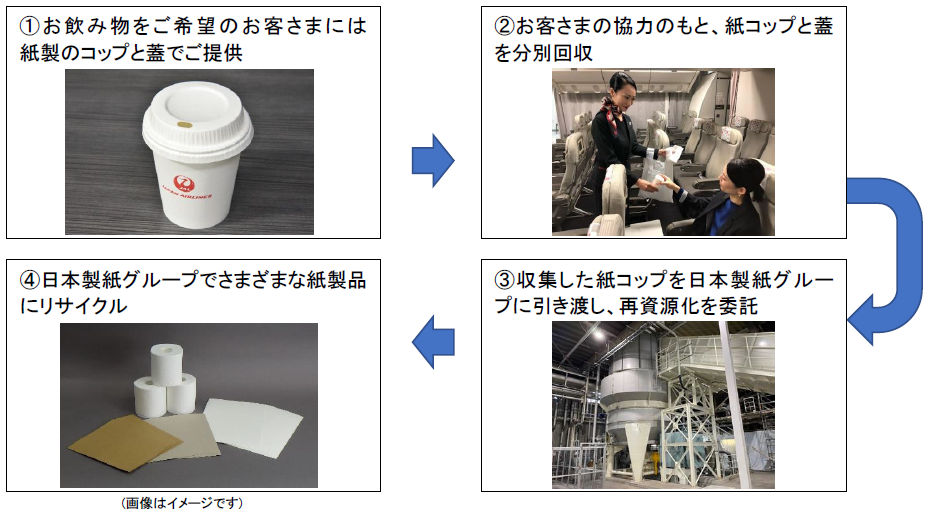 このたび、両社の協力体制の下、JALグループが機内サービスで使用した紙コップを適切に分別・回収し、日本製紙グループが使用済み紙コップの輸送、集積、梱包を行う独自のルートを構築することにより、使用済み紙コップ古紙の分別収集・リサイクルが実現可能となりました。