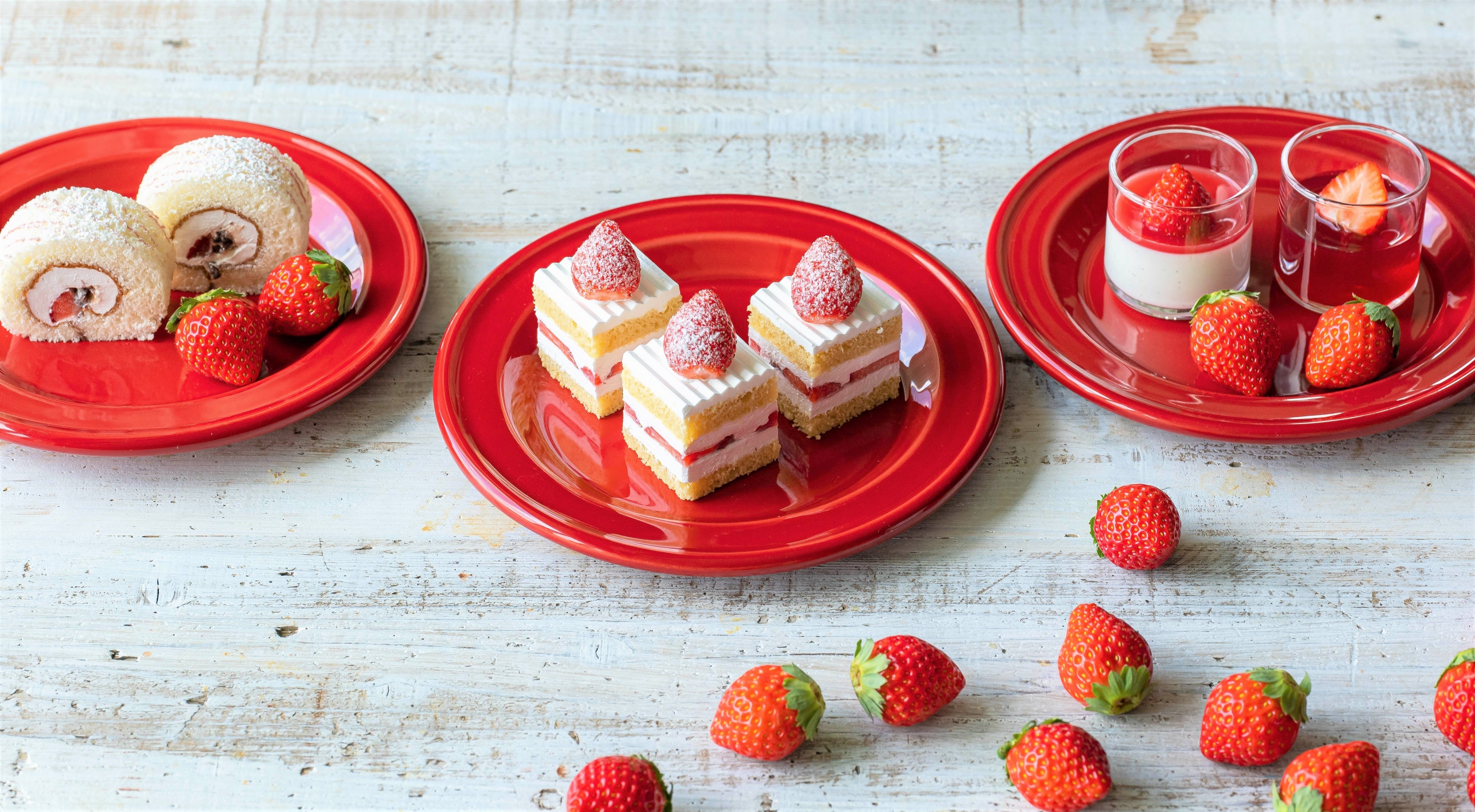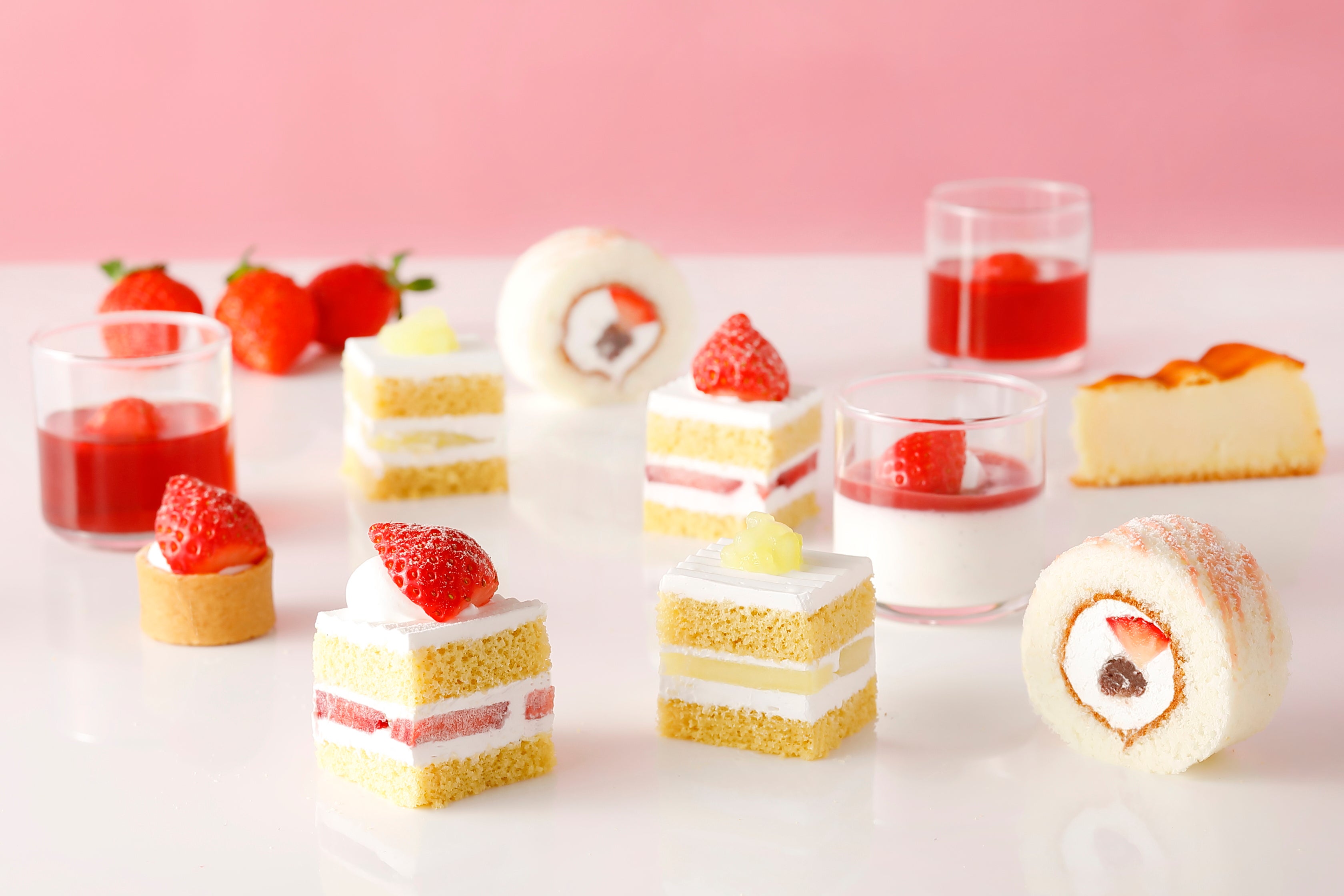 ホテルニューオータニ特製のシルキーなスポンジ生地が特徴で多くのファンを抱えるいちごスイーツの重鎮、『いちごショートケーキ』、ふんわりとしたロール生地でいちご・生クリーム・黒蜜あんこを包み、ルビーチョコレートを表面にあしらった和テイストの『いちごロール』、いちごのみずみずしい甘みとサクサクのパイ生地をお楽しみいただける『ナポレオンパイ』など、見た目も可愛らしいミニサイズのいちごスイーツをお好きなだけお楽しみいただけます。