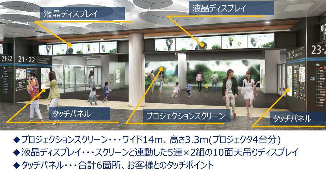 「あなたを笑顔にする、駅のシンボル」をコンセプトとして、デジタル映像を活用したアート演出により、駅を訪れるお客様の日常を彩り、癒しやワクワクをお届けします。