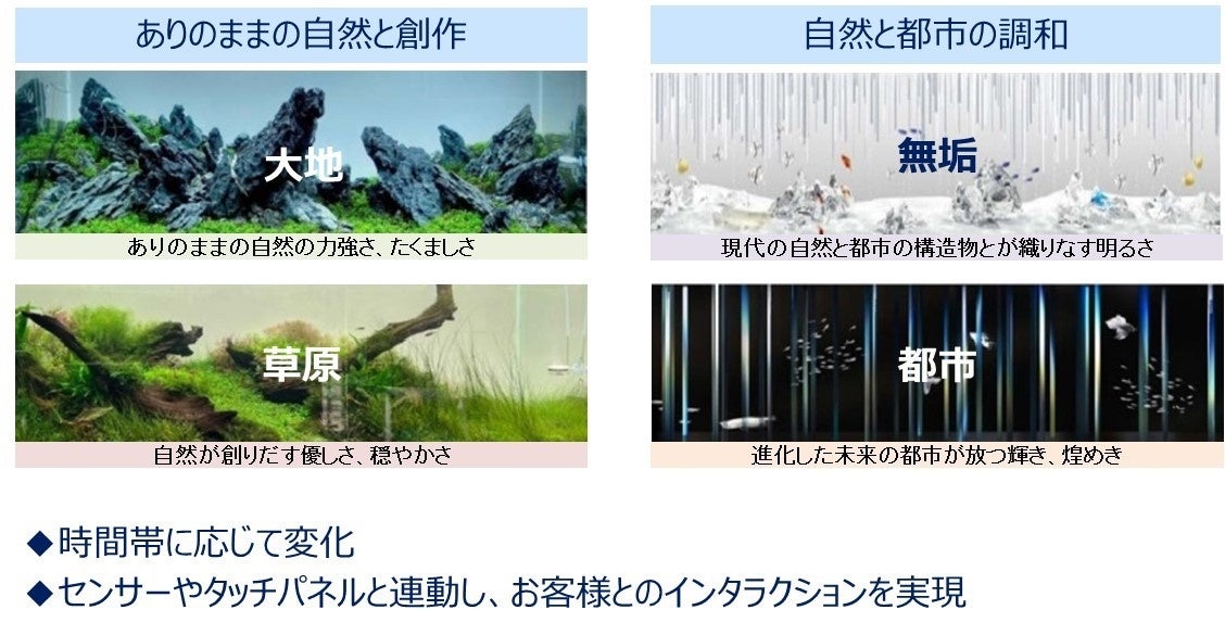 | ○未来駅に相応しい、リアル(実写)とデジタル(CG)とを融合した演出 ○水の都・大阪をイメージした「光の水景」を表現 悠久な「自然」から、未来の「都市」に進化していくストーリー |