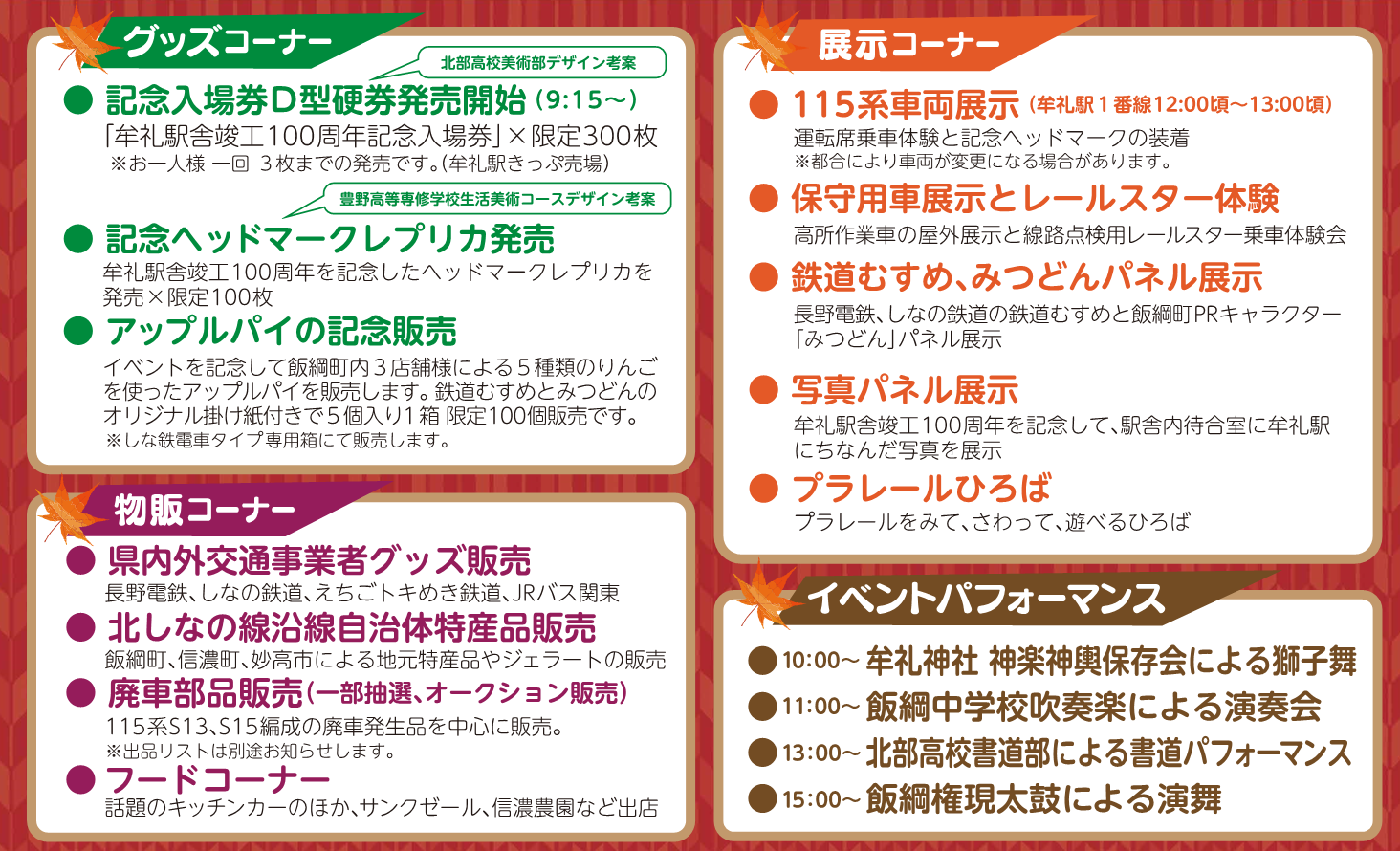 しなの鉄道株式会社(本社:長野県上田市、以下「しなの鉄道」)と、長野県飯綱町から、しなの鉄道北しなの線牟礼駅の駅業務を受託している一般社団法人飯綱町観光協会(長野県上水内郡飯綱町、以下「観光協会」)は、2022年11月27日(日)【1127・・・いいづなの日】に、牟礼駅前において牟礼駅駅舎竣工100周年としなの鉄道開業25周年を記念した共同企画「北しなの線オータムフェスタ」を開催します。