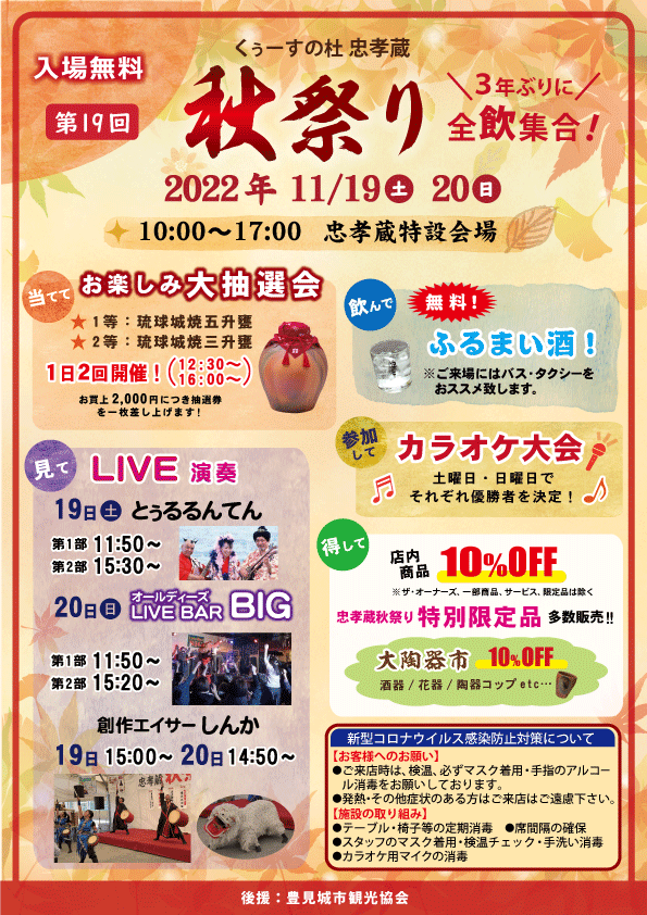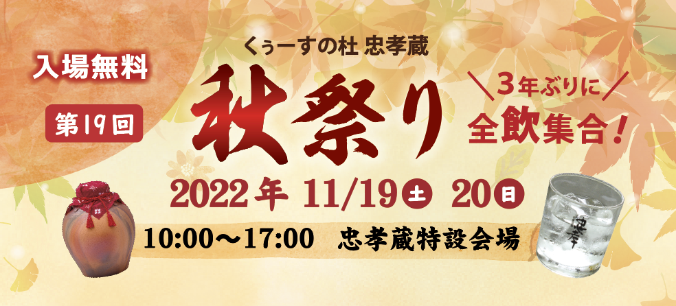 『至高の熟成を極める』忠孝酒造株式会社(本社:沖縄県豊見城市、代表取締役社長:大城 勤)は「くぅーすの杜 忠孝蔵 秋祭り」を11/19(土)〜20(日)に開催します。