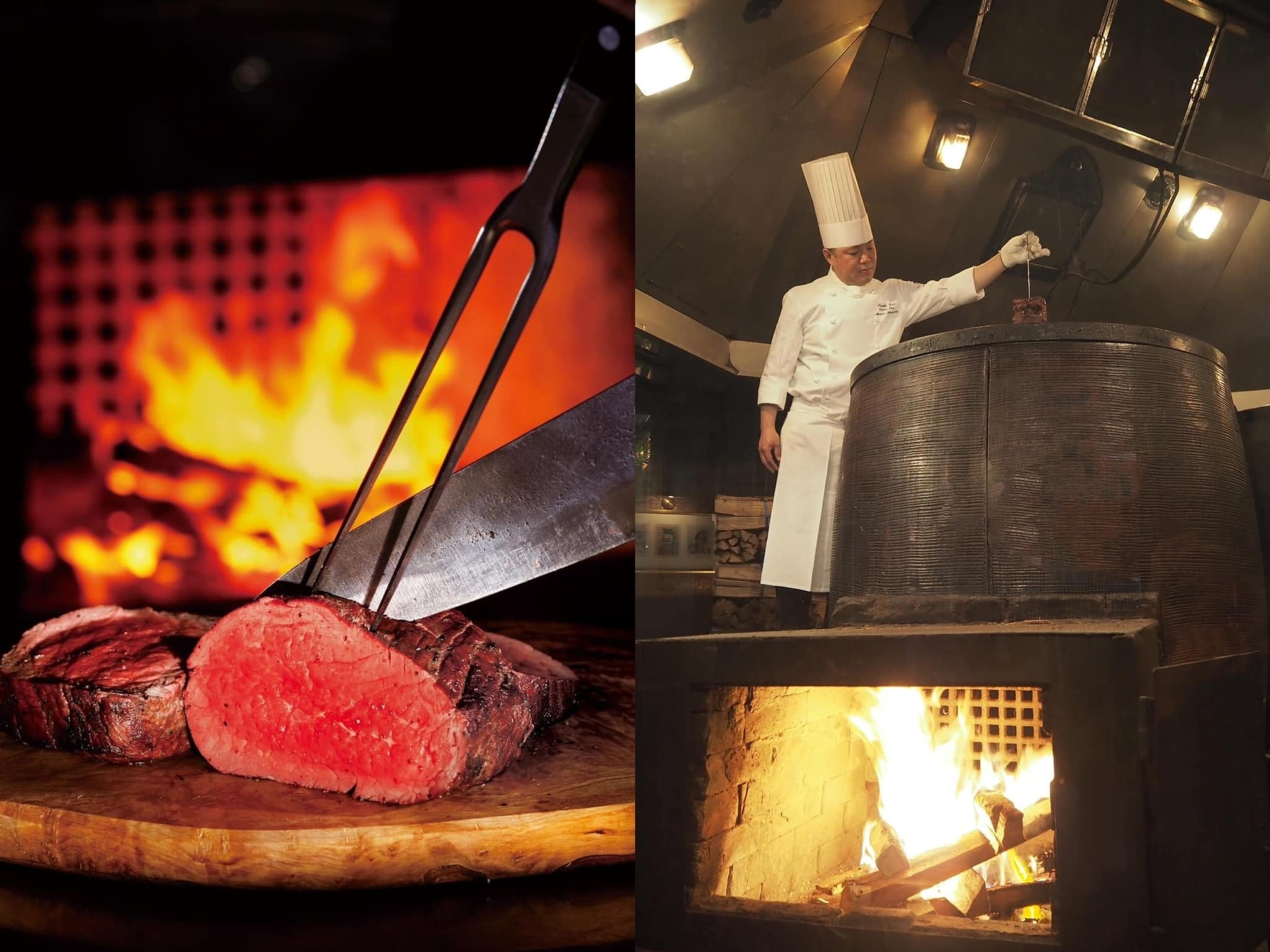 聖夜を彩るディナーコースの主役には、世界一を誇る全長2mの大きな薪窯でジューシーに焼き上げた宮崎県産牛フィレのステーキをご用意。薪窯を使用し、およそ400℃前後の輻射熱でじっくり燻し焼きすることで、素材の旨味を逃がすことなくスモーキーで芳醇な香りとともにジューシーで柔らかに焼き上げることができます。