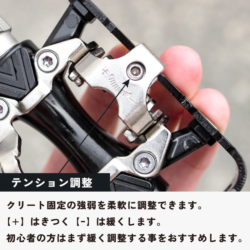 緩く調整した方がクリートをスムーズに外せるので、初心者の方はまず緩く調整する事をおすすめします。