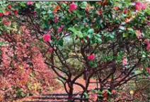 枡形山へ上る道が紅い落ち葉で覆われ、周囲にはピンク色の花をつけたツバキがたくさん咲いています。