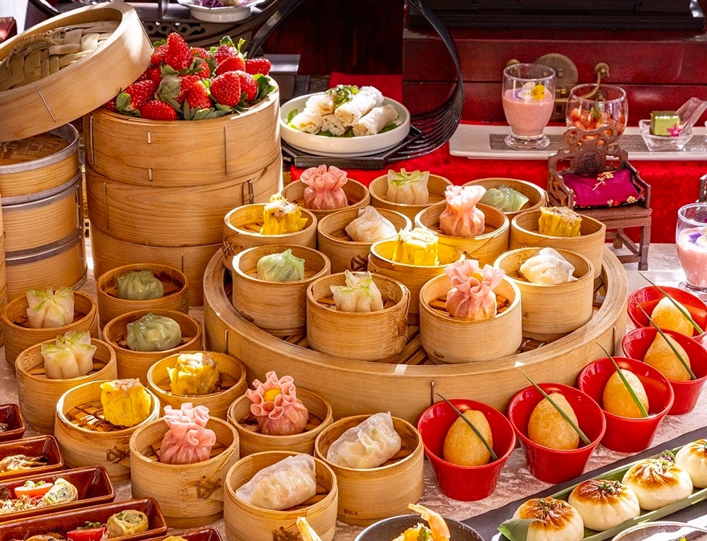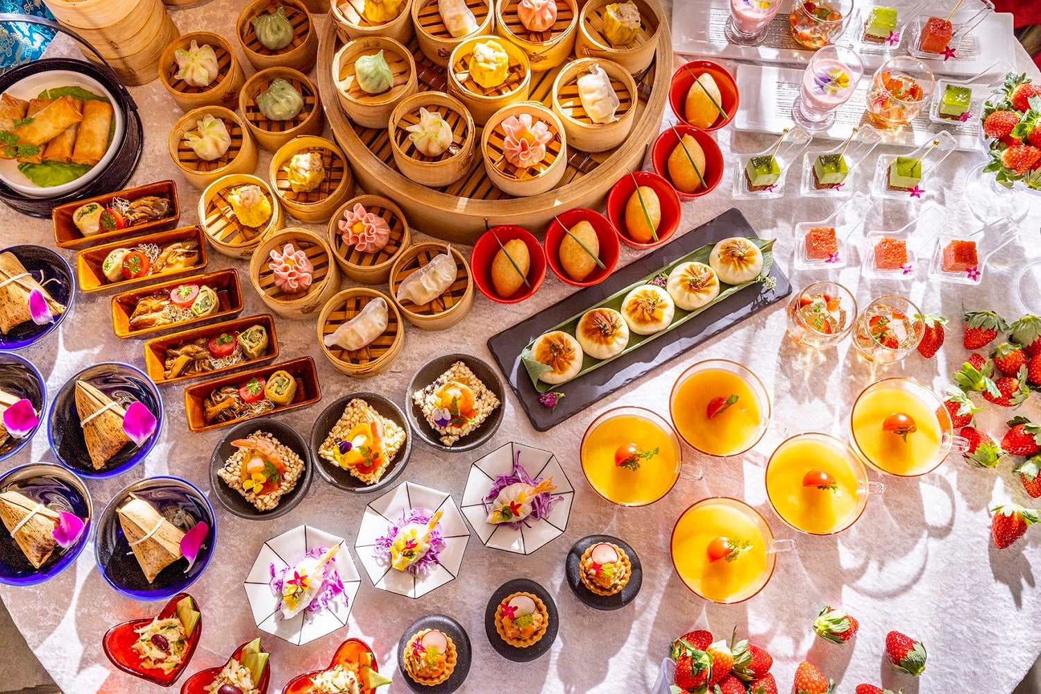 ワゴンサービスでご用意する点心は、お好きなものをお好きなだけお楽しみいただけます。花の形でご用意する「鶏肉、豚肉入り花型焼売」や美しい緑色の「翡翠海老蒸し餃子」、パリッと揚がった「海鮮ライスペーパー春巻」や、「五目揚げ団子」など10種類の点心は、熱々の状態でお席までお持ちいたします。