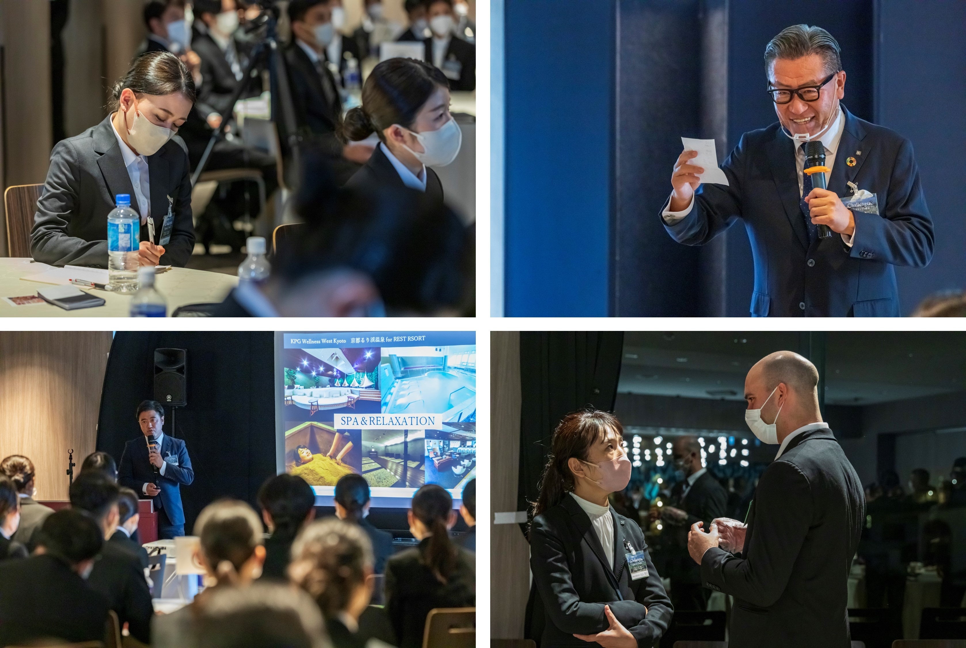 内定式の当日はカトープレジャーグループの加藤 宏明 代表取締役専務兼グループCOOと、各グループカンパニーの役員である田中 正男 取締役社長兼COO(KPG HOTEL&RESORT)、大金 直矢 取締役社長兼COO(KPG LUXURY HOTELS)、中見川 佳秀 取締役社長兼COO(KPG Wellness East)、大野 靖史 取締役社長兼COO(KPG Wellness West)、江口 翼 部長(KPG Wellness West Kyoto)が登壇いたしました。