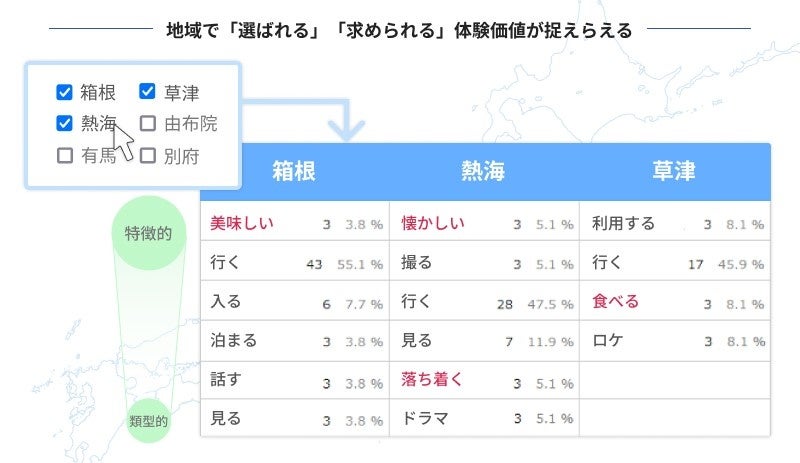 今後高まる生活者の旅行需要や旅先での体験価値を正確に捉えるため、「見える化エンジン」では膨大な定性情報(生活者調査、SNS、レビュー等)を幅広く蓄積し、見える化された分析アウトプットを提供することで、旅行・レジャー業界を支援してまいります。