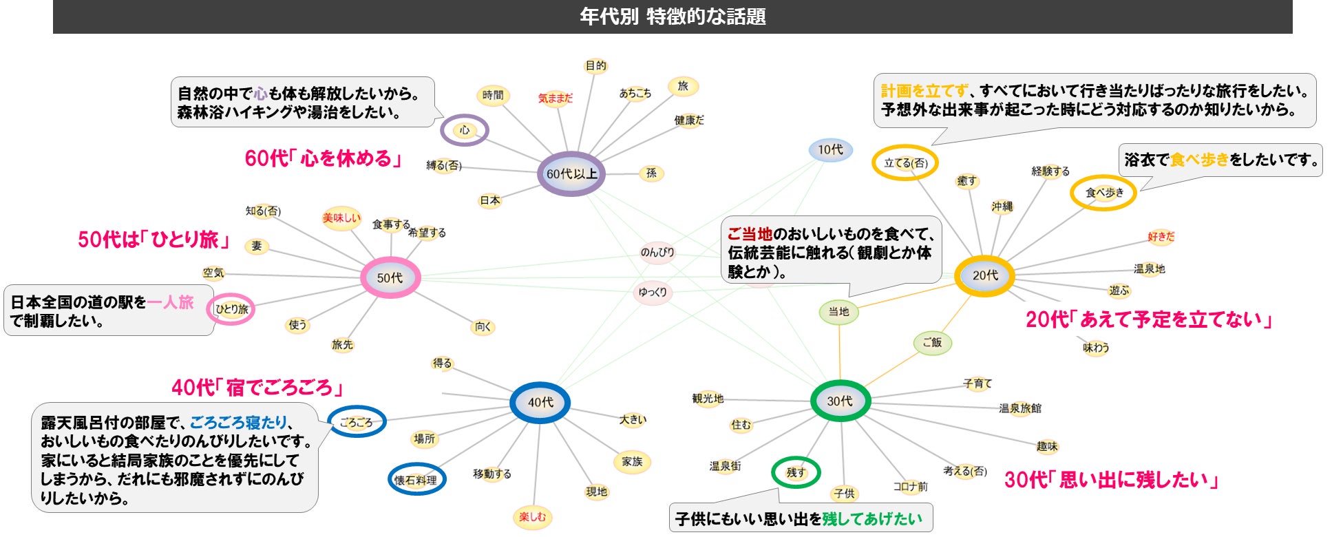 年代の円を中心として、回りにある単語がその年代の回答に特徴的な単語です。