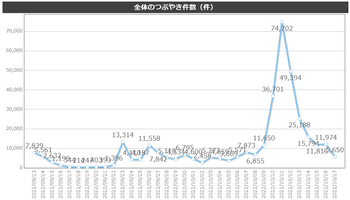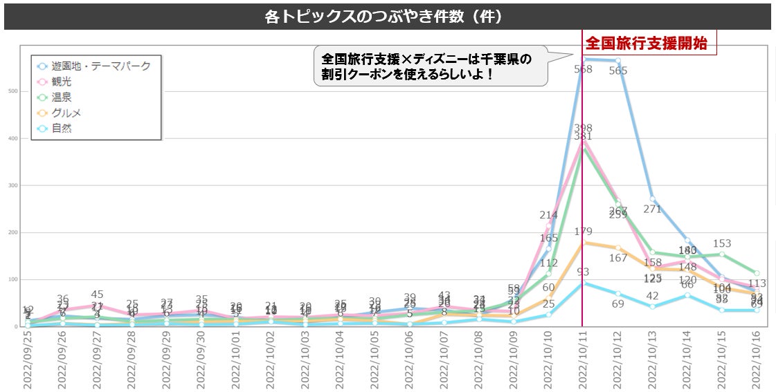 投稿件数は、全国旅行支援がスタートした10/11に急増してピークを迎え、前後3日程度で収束しています。スタート前から盛り上がり、その後施策期間中も盛り上がりが続くというよりは、開始時の話題性が特に大きかったと見ることができます。