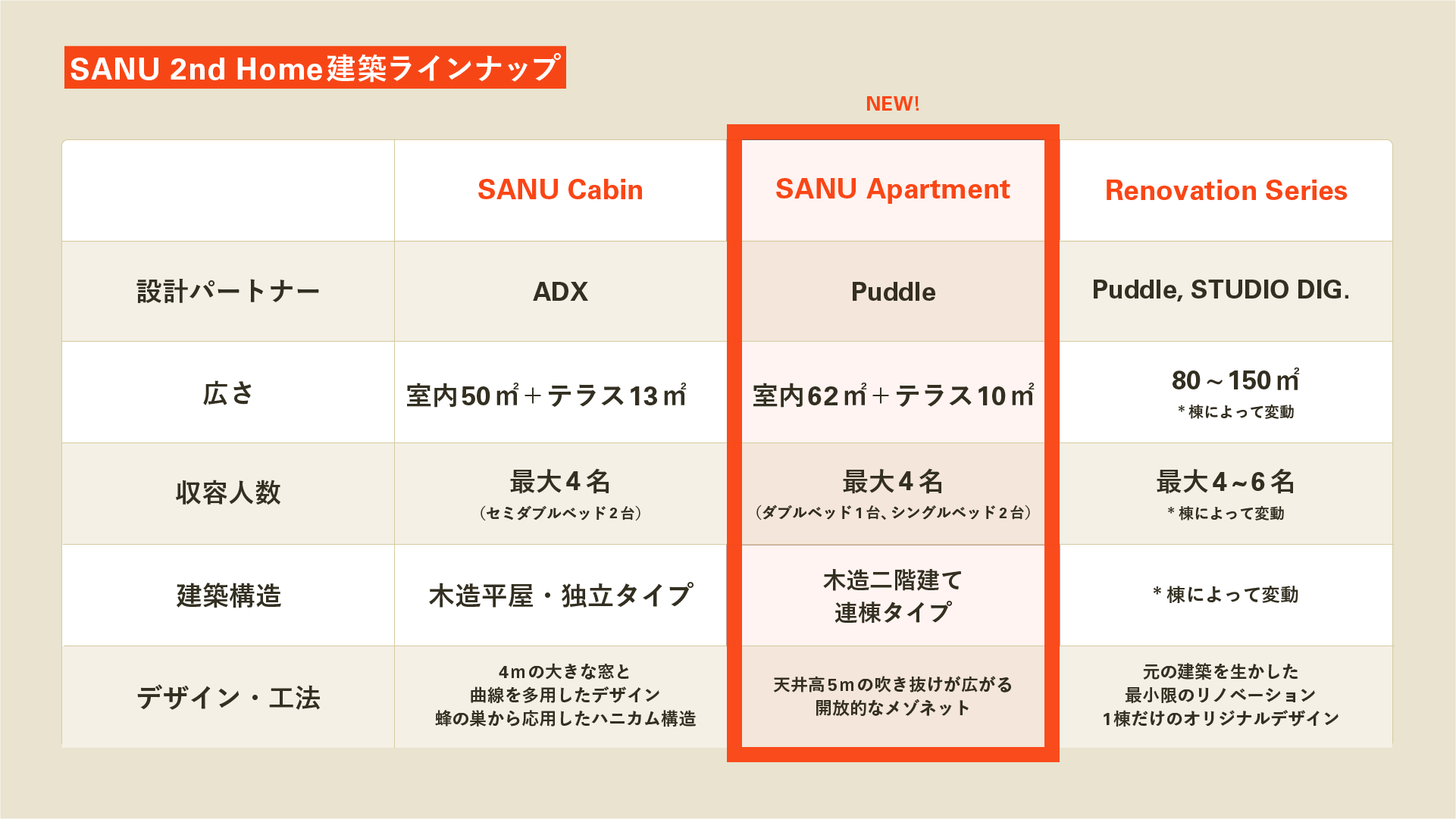 「SANU Cabin」「Renovation Series」そして新モデル「SANU Apartment」を合わせ、2023年は追加100棟着工を計画しています。