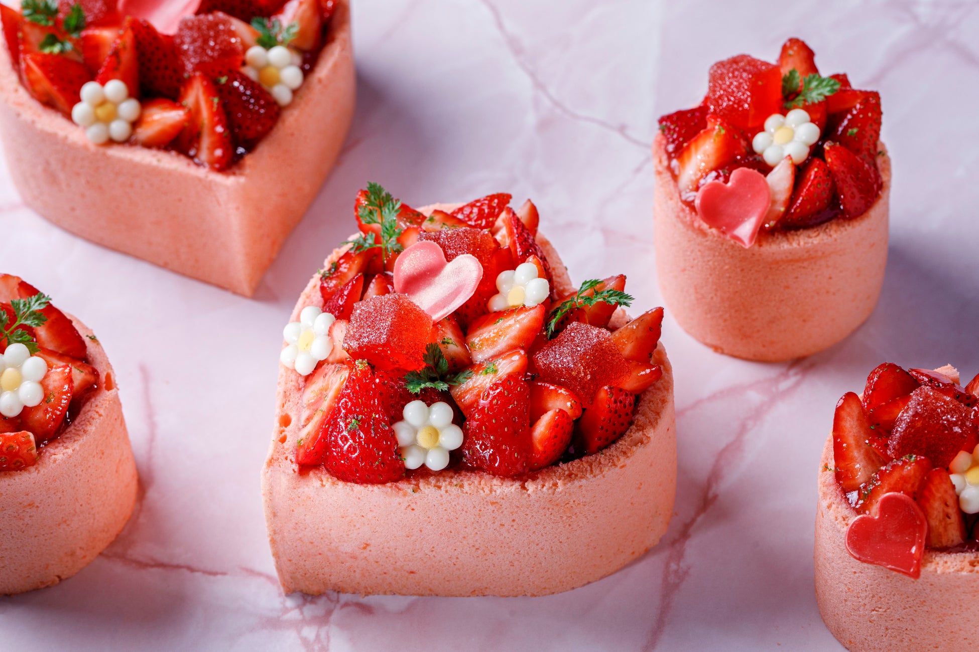 優しいピンクのスポンジに、スダチが香るバニラクリーム、果実の味わい豊かなストロベリージャムをあわせ、ヘーゼルナッツクランブルで食感の違いもプラス。フィリングの軽やかな甘みが、ふんだんにあしらったフレッシュな苺のみずみずしさを引き立てます。ハートシェイプのほか、円形のプティガトーもご用意しており、大切な方への贈り物やご自身へのご褒美スイーツにもおすすめです。