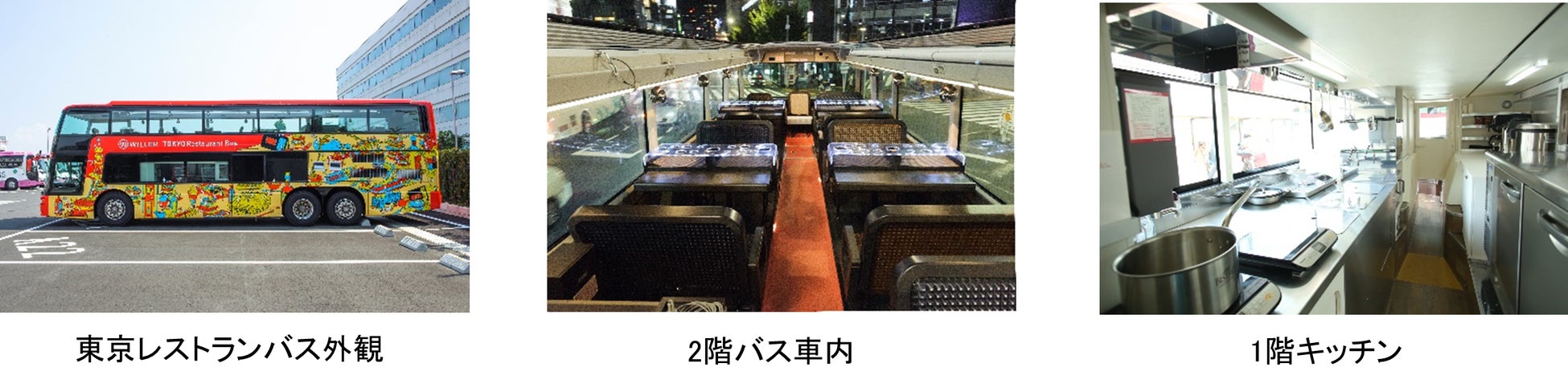 移動と食の融合により新たな感動体験を提供する「レストランバス」は、1階にキッチン、2階には対面式の座席とテーブルを備え、透明で開閉可能なオープンルーフは開放感があり、いつもと違う目線から眺める景色と、本格的な料理をお楽しみいただけます。東京レストランバスの外装は、東京らしさをイメージし、多数のビル群や観光名所を“食”と掛け合わせてポップなカラーリングでデザインしています。内装は、シックな色合いでまとめ、夜は調光可能なLEDと間接照明により、高級感あふれる落ち着いた空間になっています。