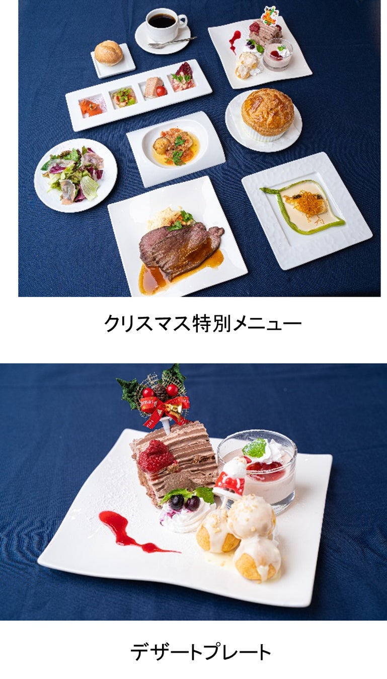 ② 料理は、お酒にも合うメインの黒毛和牛のローストビーフや、ブッシュドノエルなどのクリスマス限定のデザートプレートが付いた、本格的なクリスマスフレンチです。