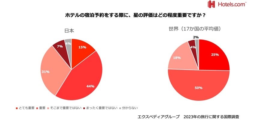 同調査結果によると、日本ではどのホテルに泊まるかを選ぶ際にホテルの星の数を重要視する(「とても重要」または「重要」と回答した人)と回答した人が59%と、世界17の国や地域の平均値(75%)と比べると低く、日本では星の数が必ずしもホテルを選ぶ重要な要素ではなくなってきていることが分かります。また、2023年のホテル選択において「今までよりもコストパフォーマンスの良さを気にする」と答えた日本の旅行者が55%を占め、次いで「朝食付き、スパ利用券付きなど、付加価値のあるホテルを予約したいと思う」と回答した人が34%と、手頃な価格で付加価値のあるホテルに注目が集まっていくことが予測できます。物価高騰に伴い、2023年の旅行者はこれまで以上に節約志向となるかもしれません。お得な3つ星ホテルでインスタ映えスポットがホテル内にあるかどうかや、ユニークな雰囲気か、素晴らしいアメニティがあるかなど付加価値の高いホテルが人気となるでしょう。