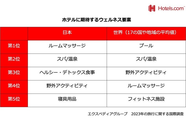 また、ホテルのウェルネス要素について質問した結果、日本ではルームマッサージが第1位で、次いでスパ・温泉やウェルネスにつながる食事(健康食・デトックス食)が好まれるなど、ホテル滞在中に経験できるサービスを重要視していることが分かりました。一方で、世界ではホテル内のプールやスパなど、ホテル内の施設が重要視されていることが明らかになりました。