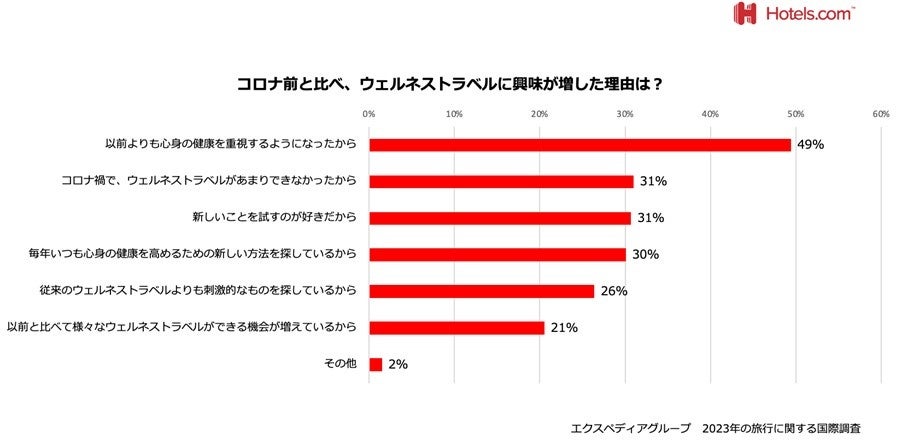 コロナ禍のストレスからか、また自由に旅行に出かけることができない日々が続いたことから、日本人旅行者の49%は「以前よりも心身の健康を重視するようになった」と、「ウェルネストラベル」への関心の理由を挙げています。