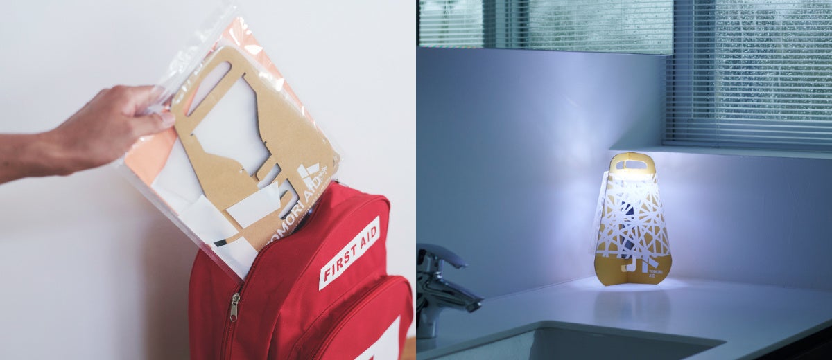 「TOMORI AID(トモリエイド)」はデザイナー自らの避難体験から生まれた、組立てて懐中電灯をいれる事で直線的な光をランタンの様な周囲を照らす光にできる折り畳み式段ボール製照明キットです。「避難時に防災バッグに入れて持ち運べる携帯性」と「飾りたくなるデザイン性」を兼ね備えた、普段使いもいざという時にも役立つあかりです。