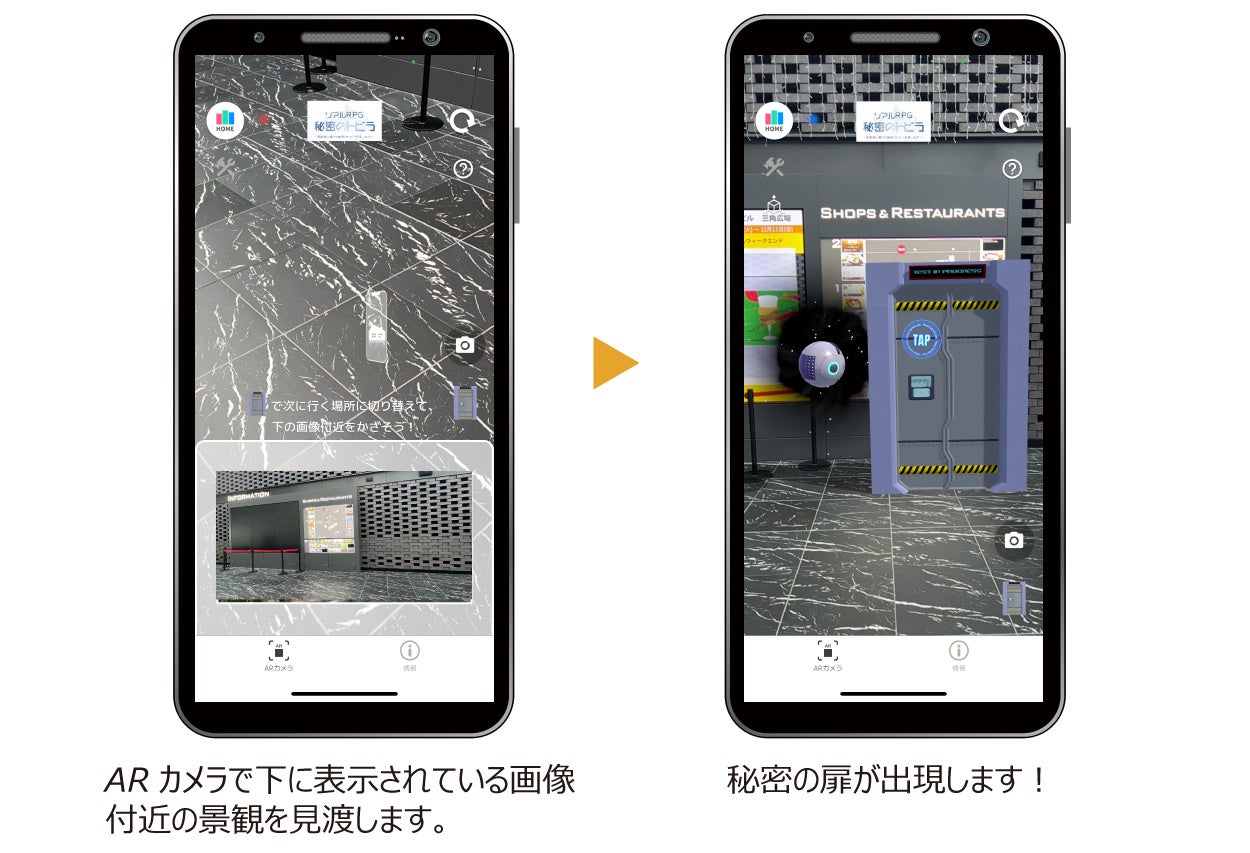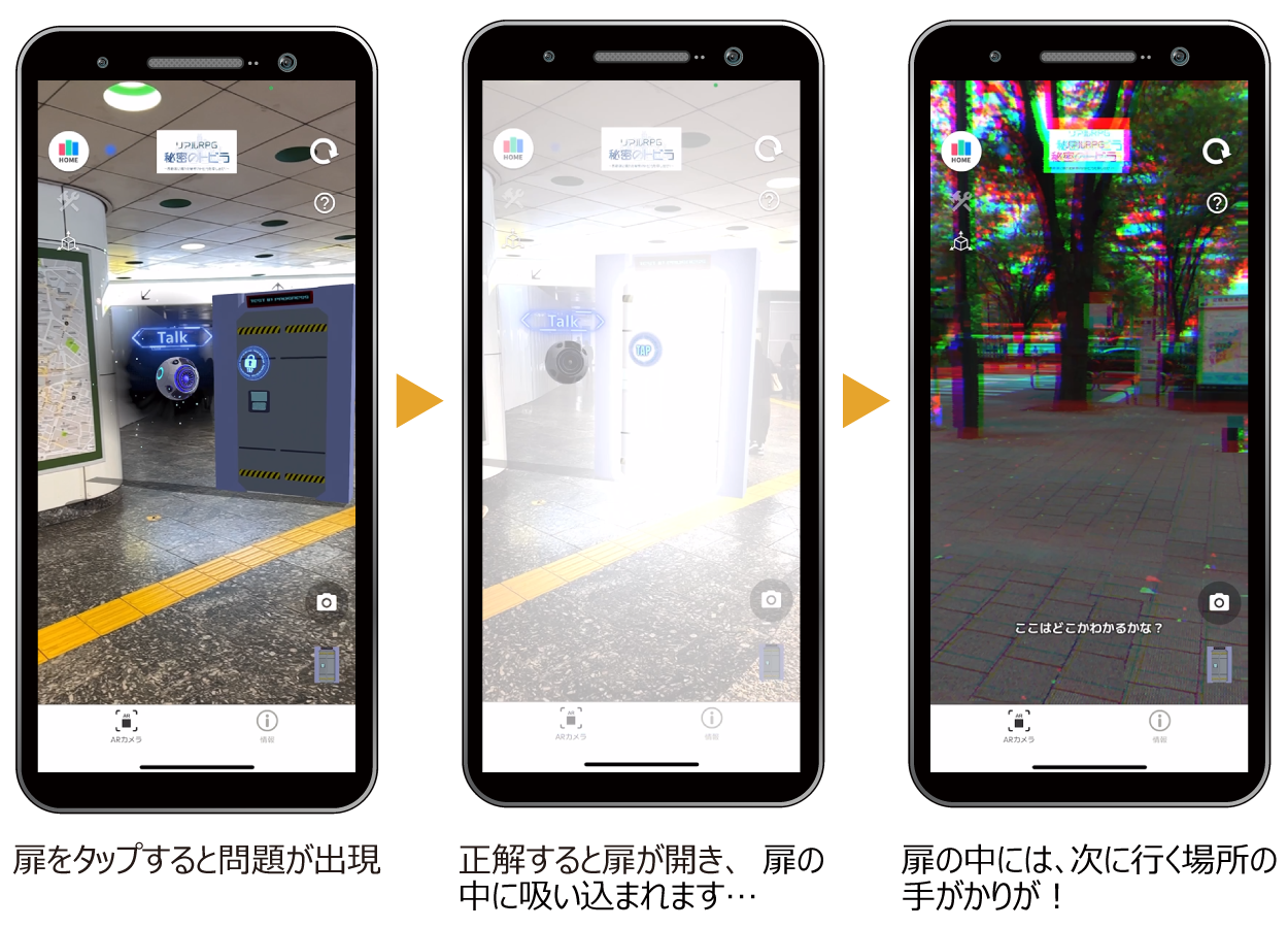 MetaTownのアプリで、西新宿の街中の景観をかざすと秘密のトビラ(扉)がARで現れます。本企画では、この扉の中が次に行く場所の手がかりになります。