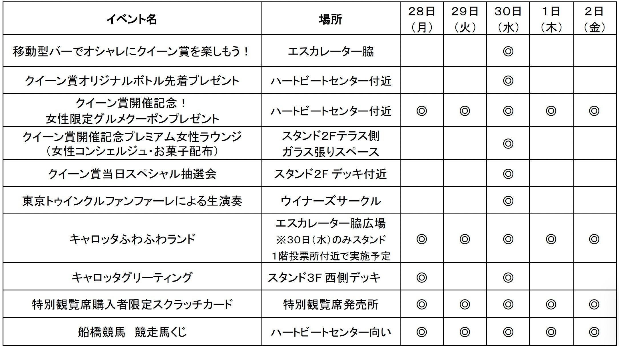 クイーン賞の開催を記念して、女性のお客様(お子様も可)に開門時と18時以降に先着で各日各時間50名様にグルメクーポン200円分をプレゼント。またお連れのお客様にもプレゼントいたします。