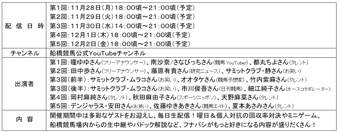 船橋競馬では、令和4年度第8回船橋競馬〔令和4年11月28日(月)~12月2日(金)〕について、新型コロナウイルス感染拡大防止対策を講じた上で、滞留人数3,000人(うち特別観覧席166人)までの有観客開催となります。場内イベントのお知らせは、次頁以降に詳細を記載しておりますのでご覧ください。また、入場および施設の利用につきましては、「令和4年度第6回から第8回までの船橋競馬の入場について」(https://blog.f-keiba.com/info/2022/09/post-318c.html)をご確認ください。