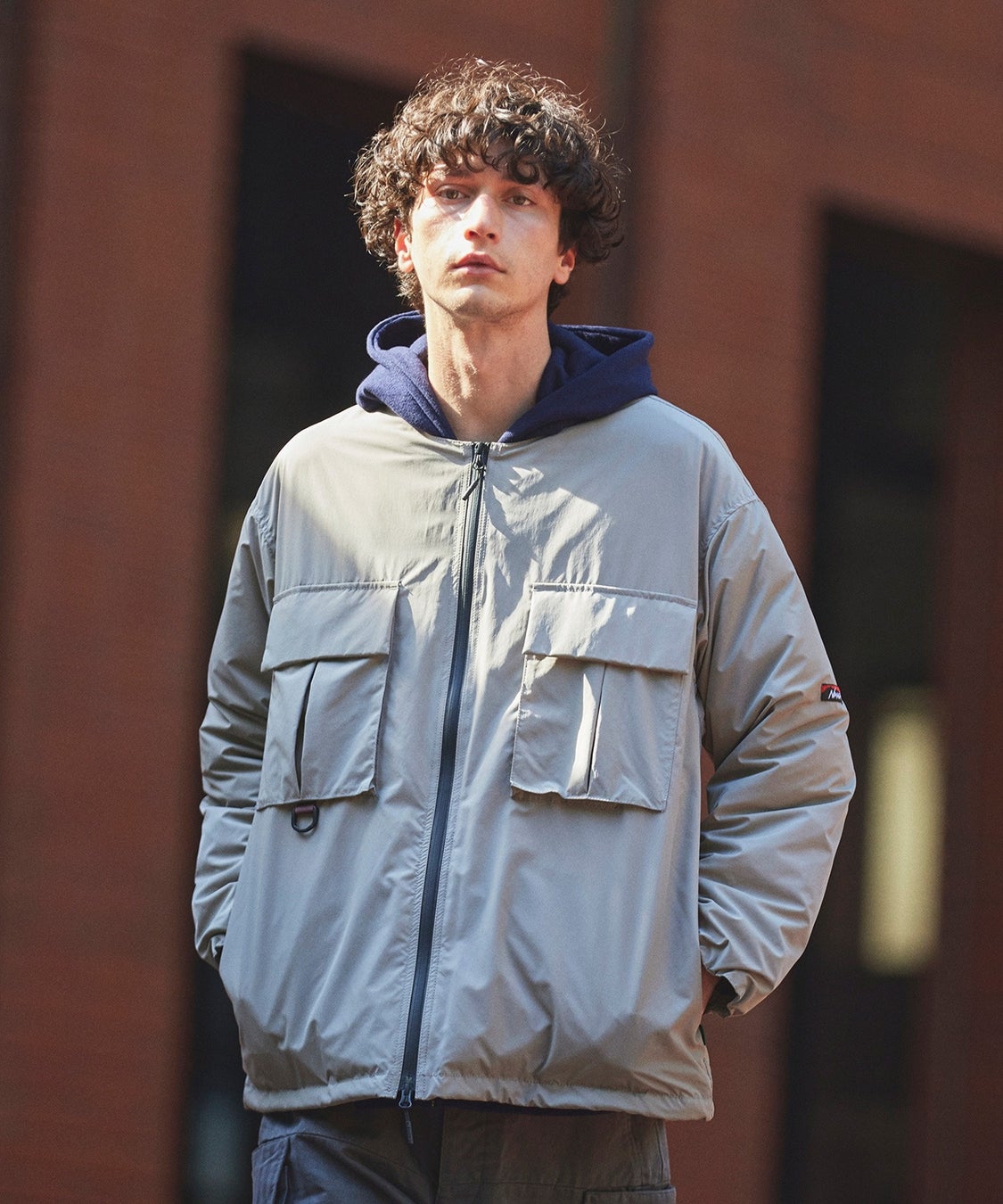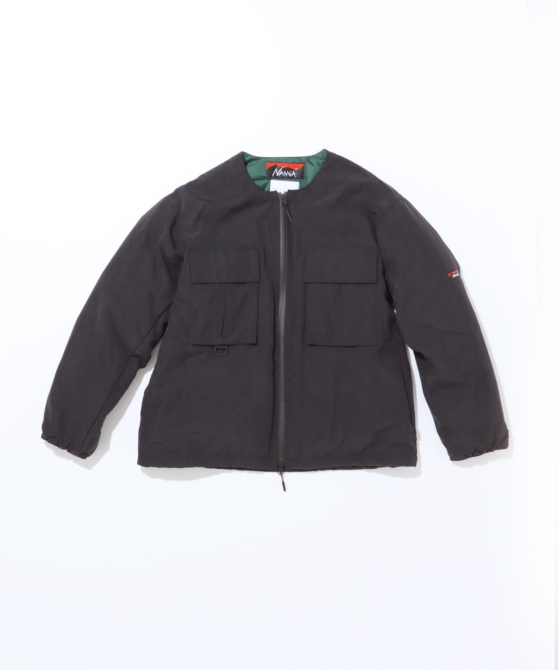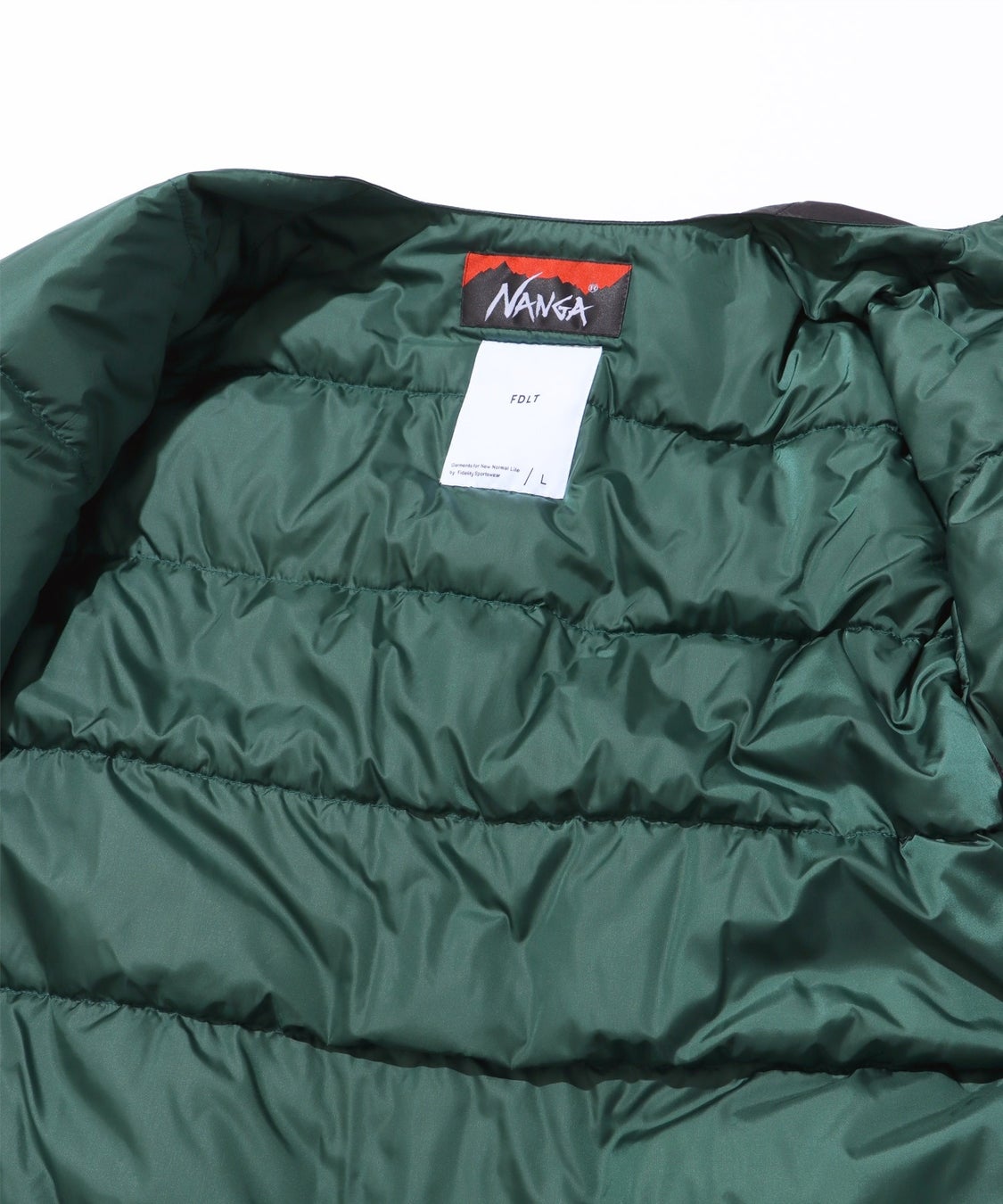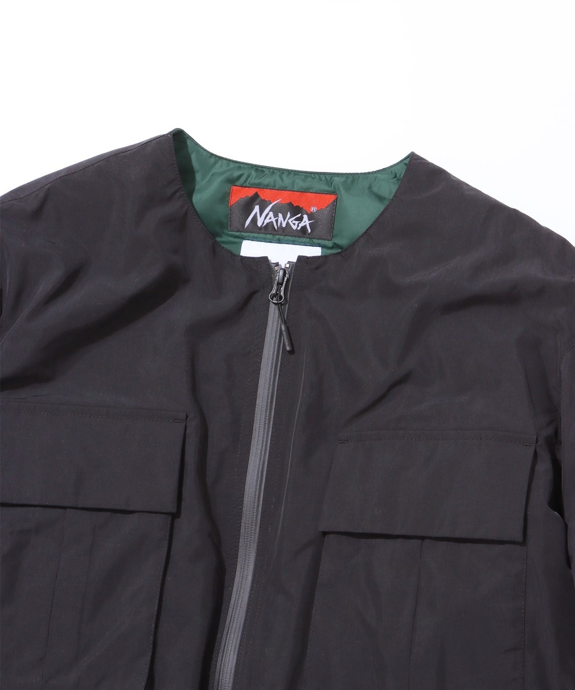 ・23S/Sコレクションで人気を博したFIDELITYのノーカラーブルゾンをベースに、前開きをスナップボタンから止水仕様のファスナーにするなど、よりアウトドアに適した形にアップデート。さらにNANGAのシュラフに使われているダウンを使用し保湿性が高いブルゾンに仕上げた。