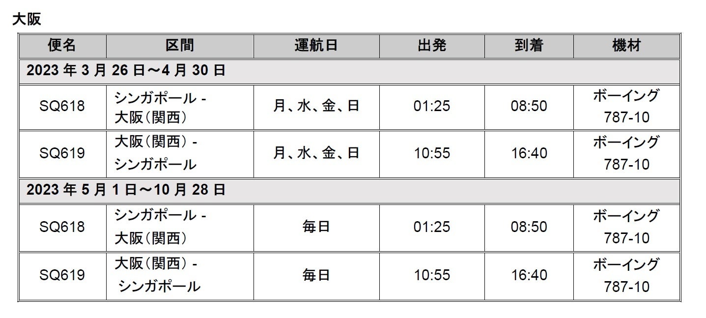 シンガポール-大阪線は2023年3月26日~4月30日の期間、SQ618便、SQ619便のみデイリー運航から週4便に変更し合計で週11便となりますが、2023年5月1日より再び毎日2便となります。