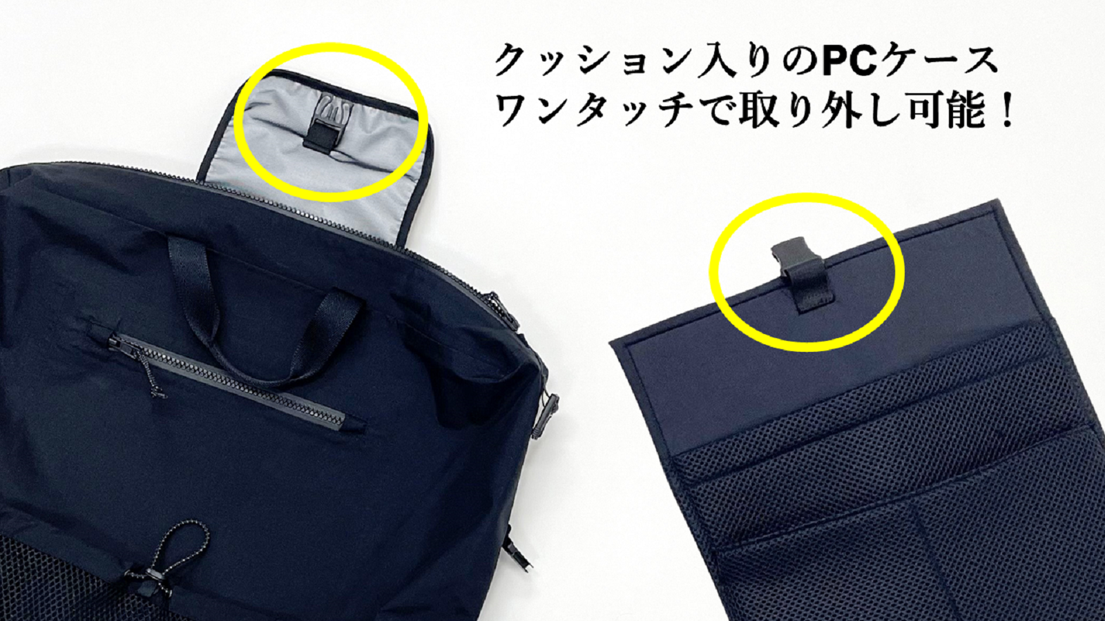 今回のプロジェクトはアウトドア級の防水性を兼ね備え、簡単にトートバッグになる2WAY仕様・手ぶらフック機能・PCケースなど実用性のある機能が充実しています。
