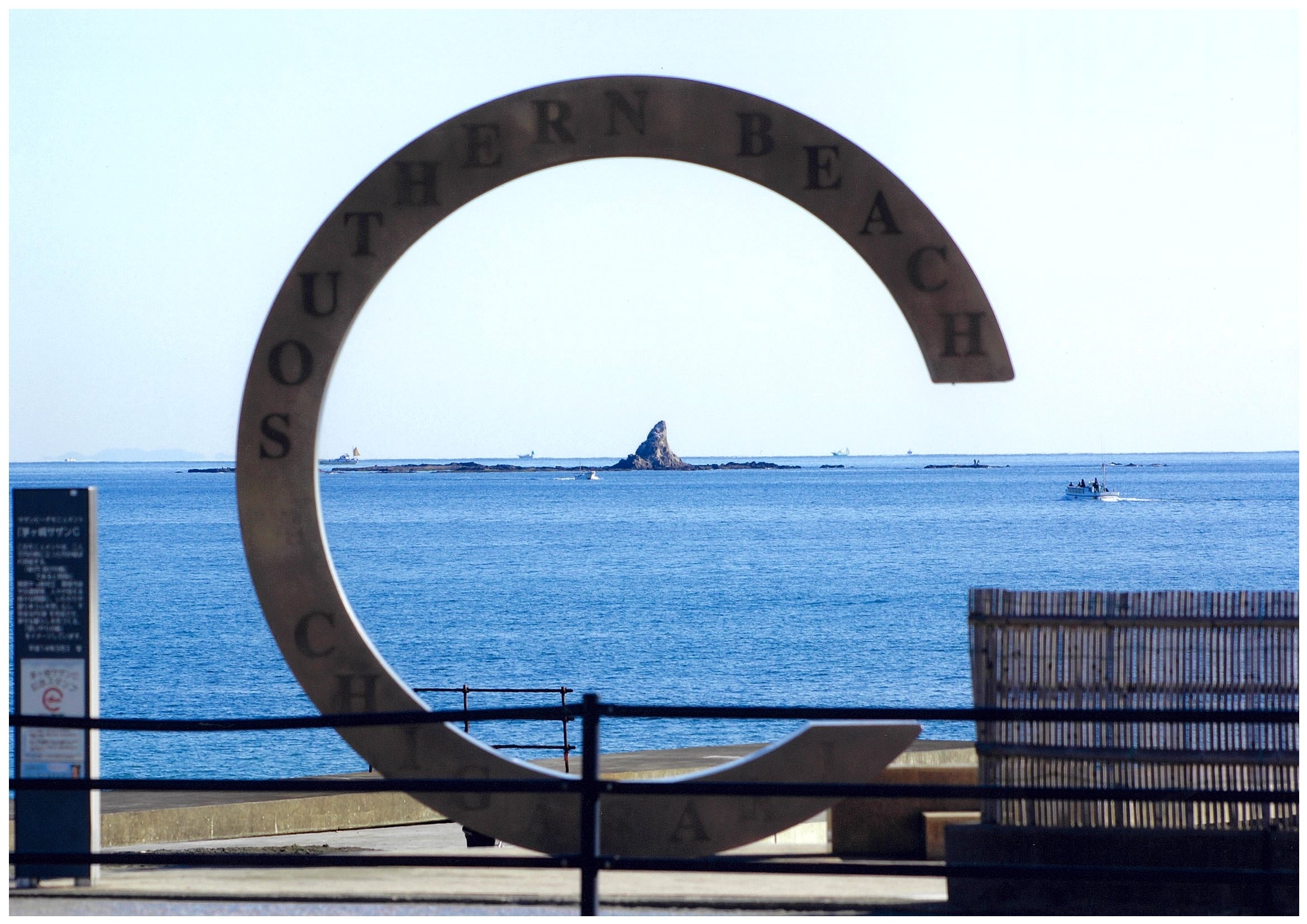 湾岸にある、茅ヶ崎市の代表的なスポットと言えば、「サザンビーチちがさき」。夏だけではなく、年間通じて多くの人が訪れる場所です。正面には茅ヶ崎市のシンボル「えぼし岩」が見え、遠くには江の島、富士山が望めます。