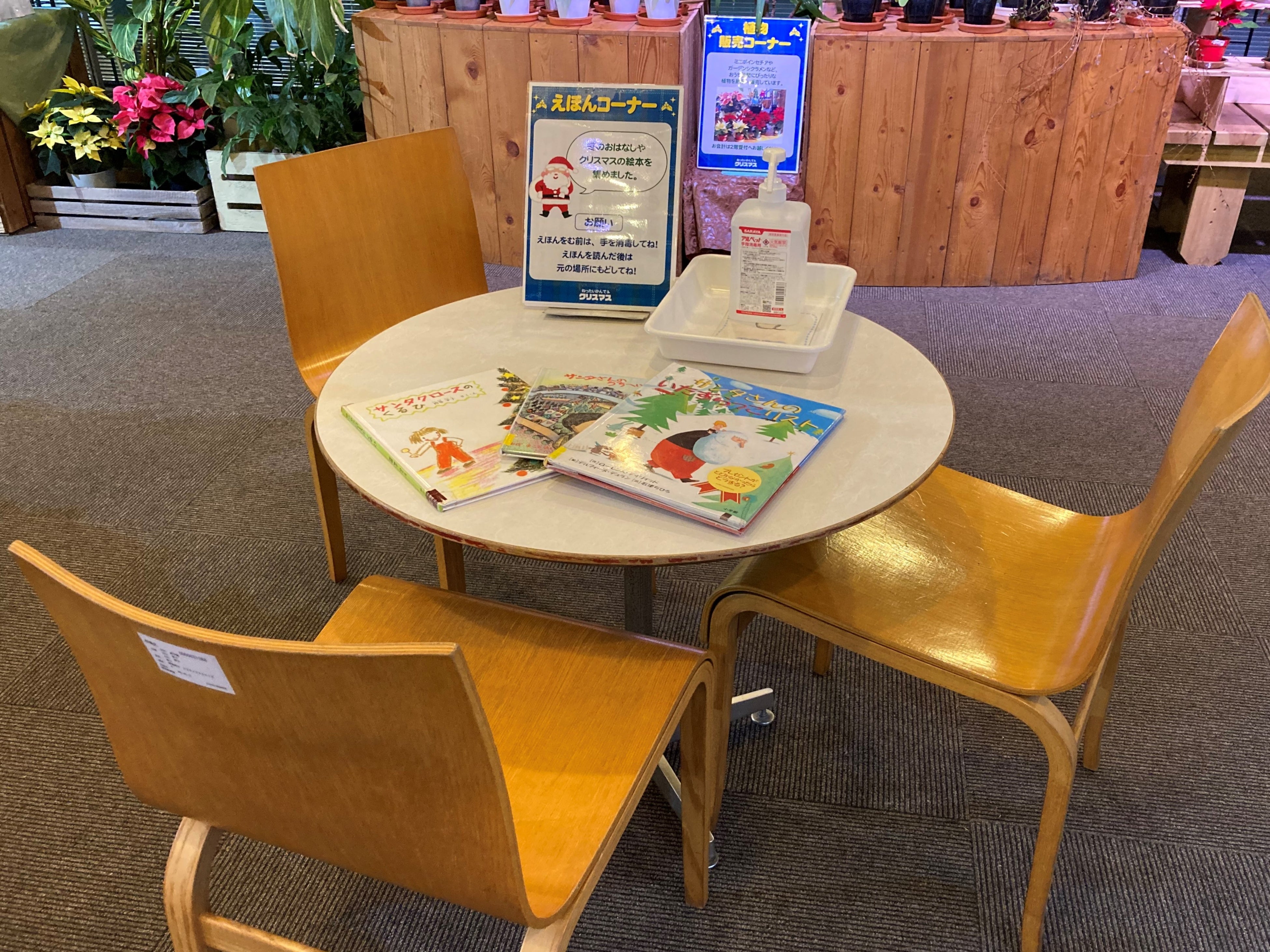 クリスマスのアニメをお子さまと一緒に椅子に座ってゆっくり鑑賞いただけるコーナーと、クリスマスの絵本を楽しめるコーナーが登場。