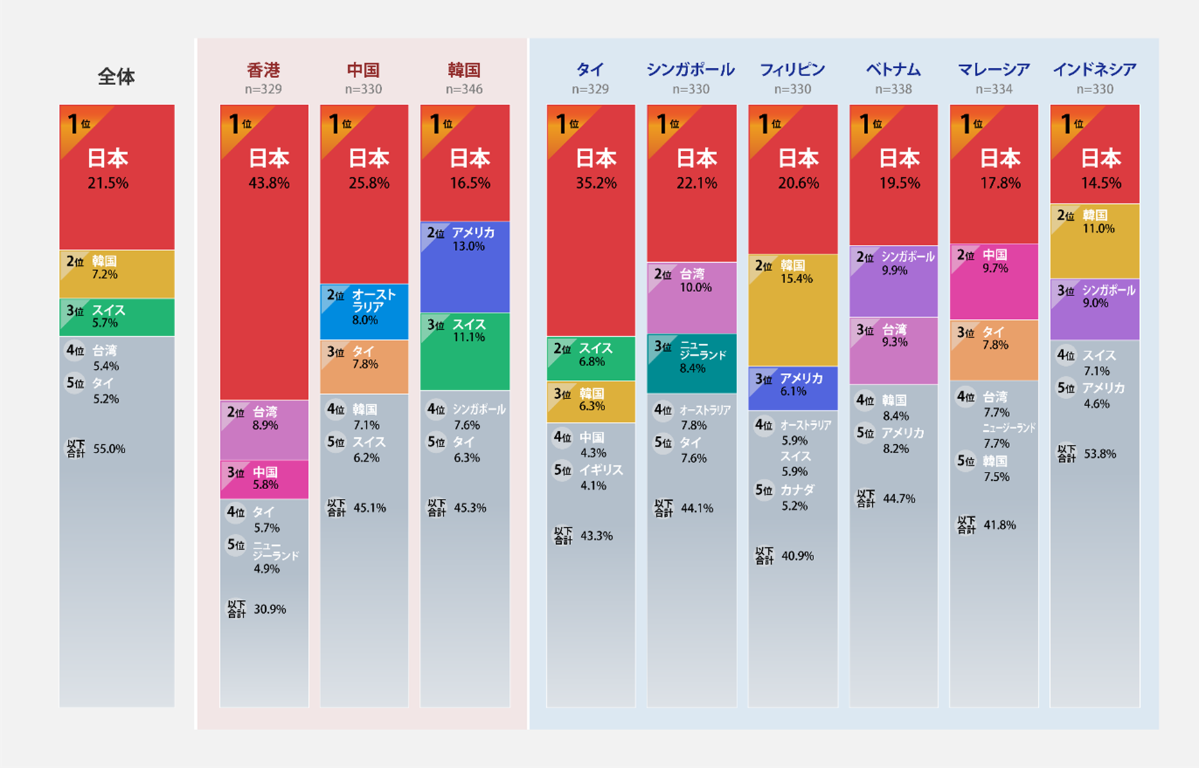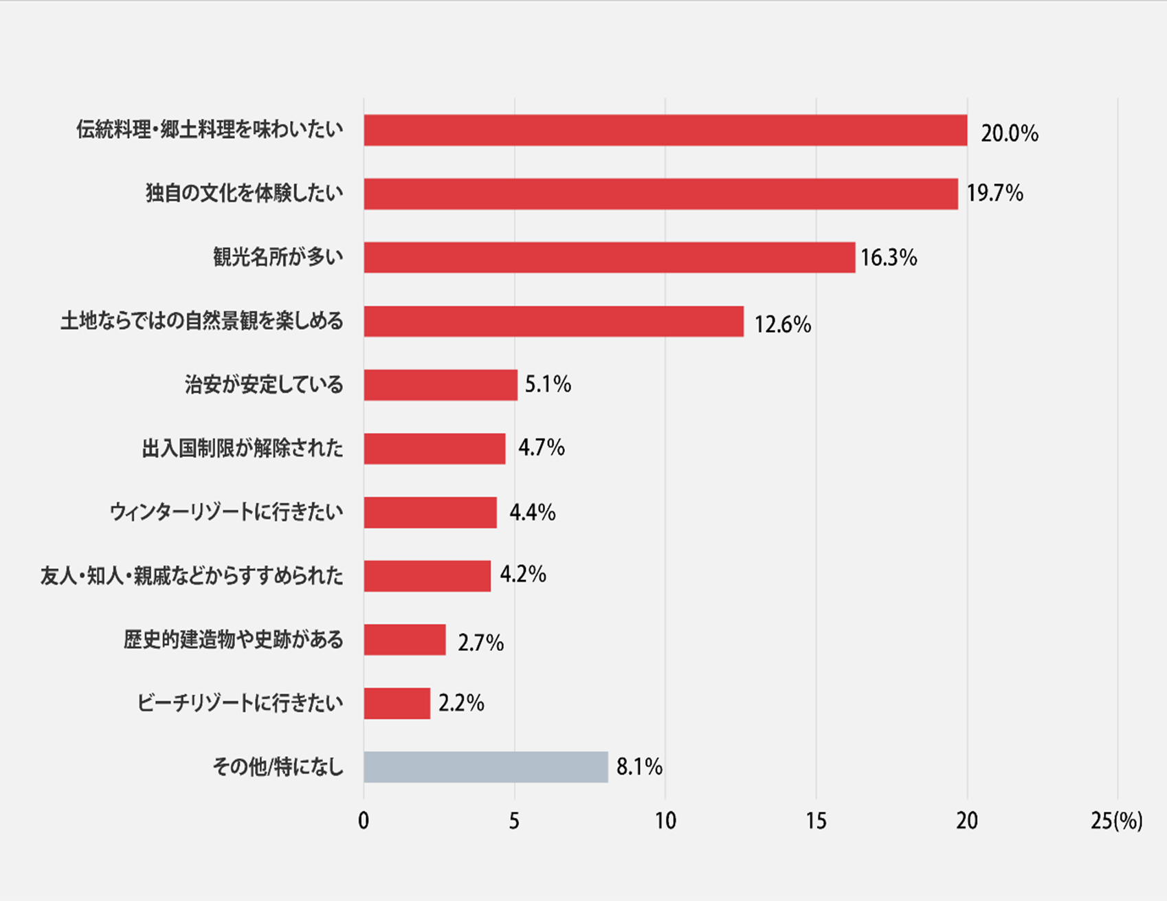 近い将来もっとも行きたい国を聴取したところ、日本以外の9カ国・地域すべてにおいて日本が1位(全体平均21.5%)という結果になった(図1)。日本を選んだ理由について見ていくと、全体では「その国の伝統料理・郷土料理を味わいたい」(20%)、「独自の文化を体験したい」(19.7%)、「観光名所が多い」(16.3%)が上位のほか、「治安が安定している」「出入国制限が解除された」といった回答も見られ、日本の現状を踏まえて訪日旅行を前向きに検討している人がいると考えられる。また国・地域別に見ると、韓国では「友人・知人にすすめられた」、シンガポールや香港では「ウィンターリゾートに行きたい」、自由記述では「アニメ」「円安」といった回答も一部で見られた(図2)。