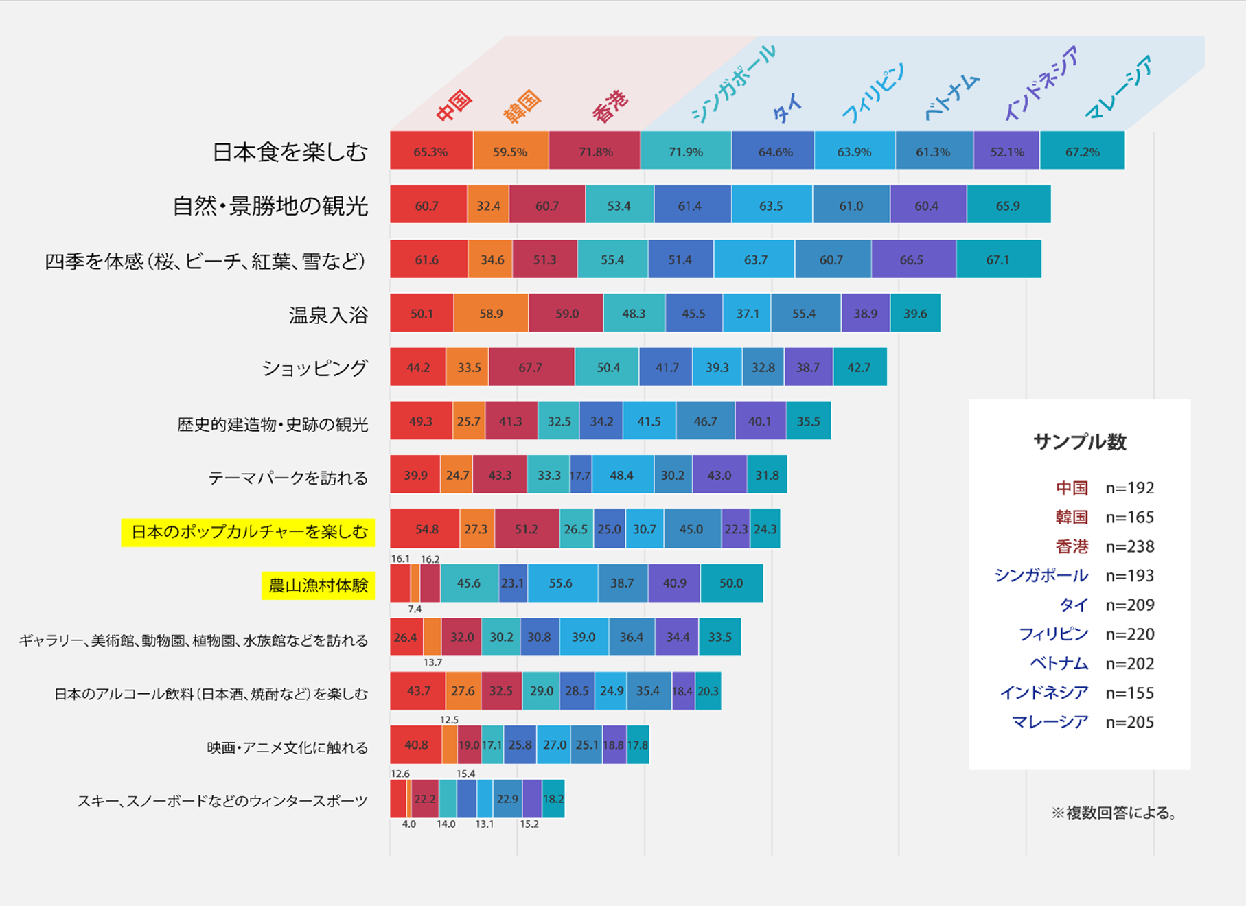 また、近い将来日本に行く予定がある・行きたいと思っていると回答した人を対象に、今後日本を訪れたらどんな体験をしたいかという質問に対しては、全体で「日本食を楽しむ」(64.7%)、「自然・景勝地の観光」(58.3%)、「四季を体感(桜、紅葉、雪など)」(57.1%)、「温泉」(48.2%)、「ショッピング」(44.2%)が上位5位となった。6位以降のアクティビティは国・地域によって差があり、中国、香港、ベトナムでは「日本のポップカルチャー」「アニメ」、インドネシア、フィリピンでは「テーマパーク」への関心が高い結果となった。また、ASEANの国々では「農山漁村体験」「ウィンタースポーツ」を選択した回答者が多く、都市だけでなく地方滞在への興味関心も高まっていると考えられる(図4)。