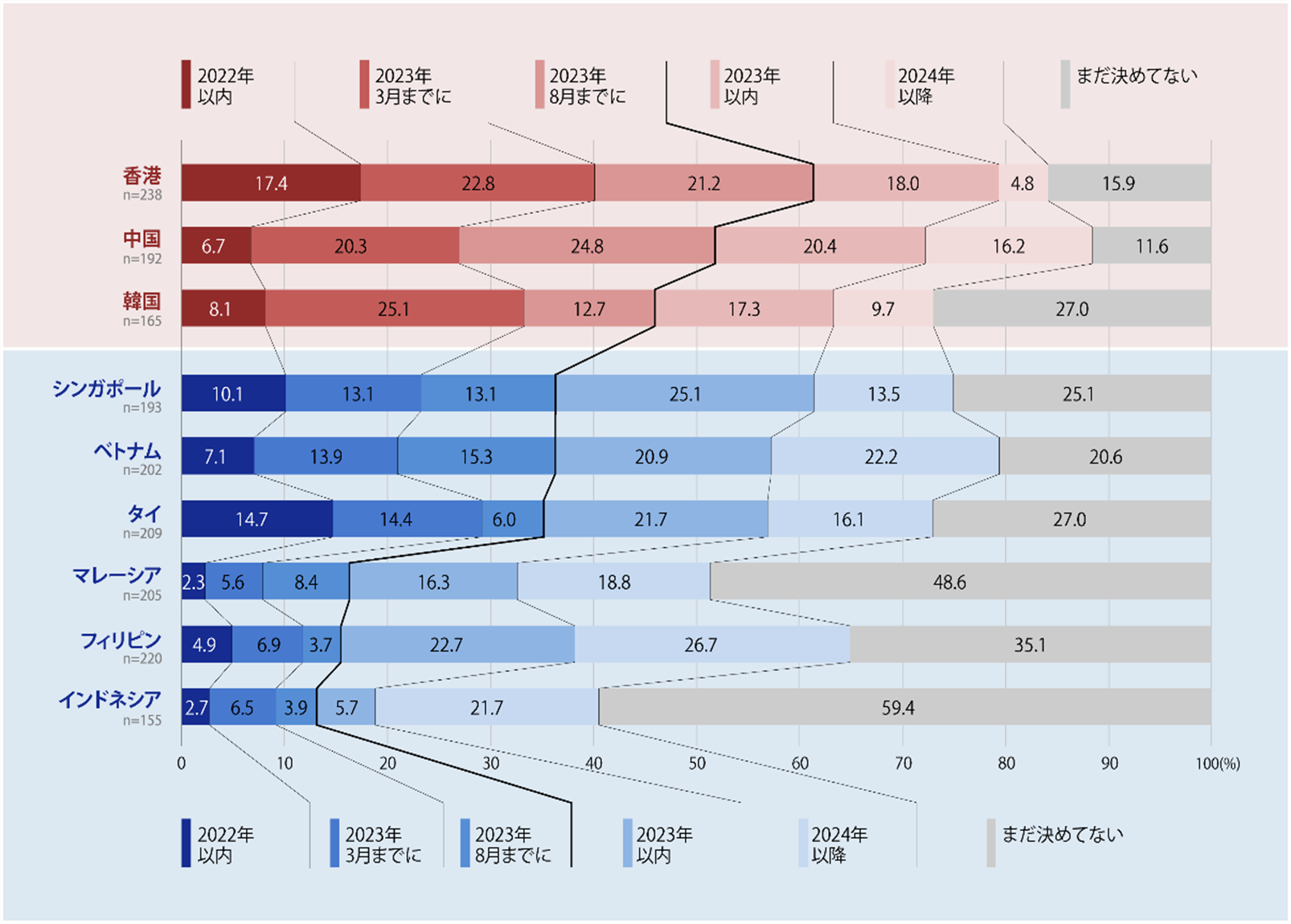 訪日旅行の検討時期に関しては、東アジアでは「2023年3月まで」(22.6%)、「2023年8月まで」(20%)が多い一方で、ASEANでは「未定」(35.1%)、「2024年以降」(19.9%)といった海外旅行に慎重な回答が多く、中国、韓国、香港などの日本に近い国・地域の方が訪日旅行をより現実的に検討していると考えられる(図3)。