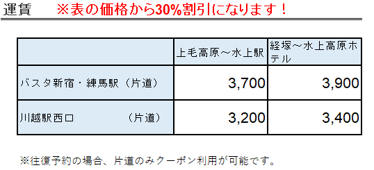 概要:期間中、上記の「楽天トラベル」該当ページよりみなかみ温泉号の30%割引クーポンをクリックしてクーポンを獲得してから、みなかみ温泉号の予約ステップで表示される割引クーポンを選択いただくと、実質30%割引でご乗車いただけます。※往復予約の場合、片道のみクーポン利用が可能です。