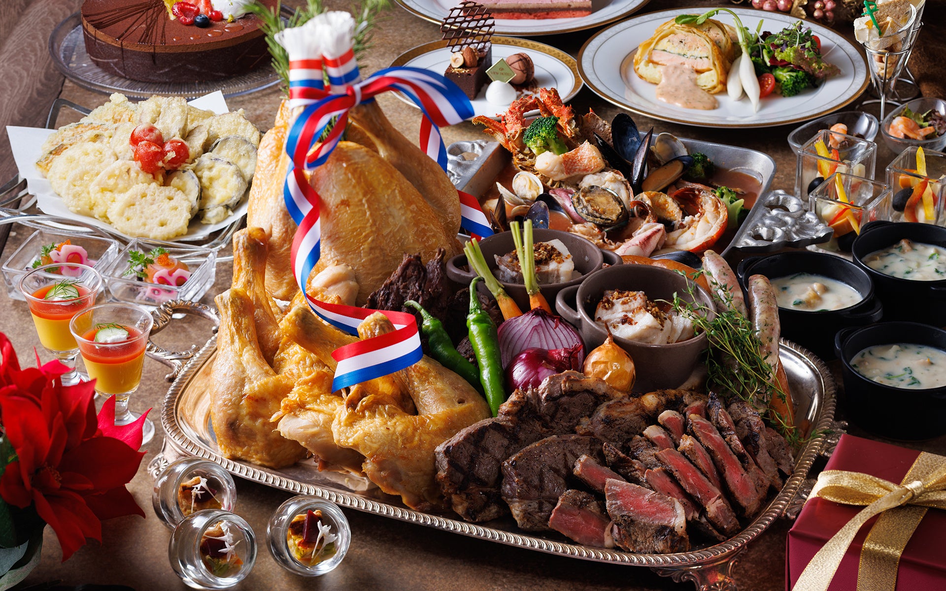 クリスマスディナーでは、通常のブッフェメニューに加え、国産牛のローストビーフ、スペアリブ黒酢ソース、仔羊の香草パン粉焼き、ローストチキン、猿払産ホタテのブルギニョンなどのお料理をご用意してています。