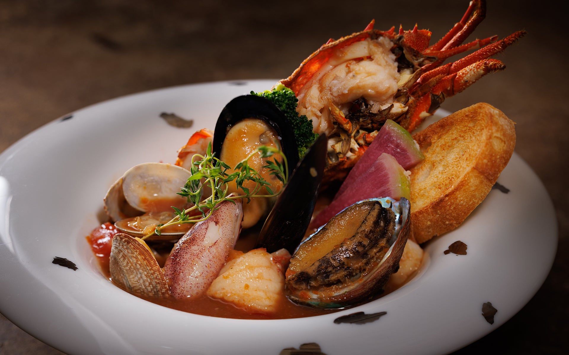 伊勢海老のほか、ムール貝、アサリ、アワビなど新鮮な魚介類を使い、濃厚な旨味を引き出したブイヤベースです。