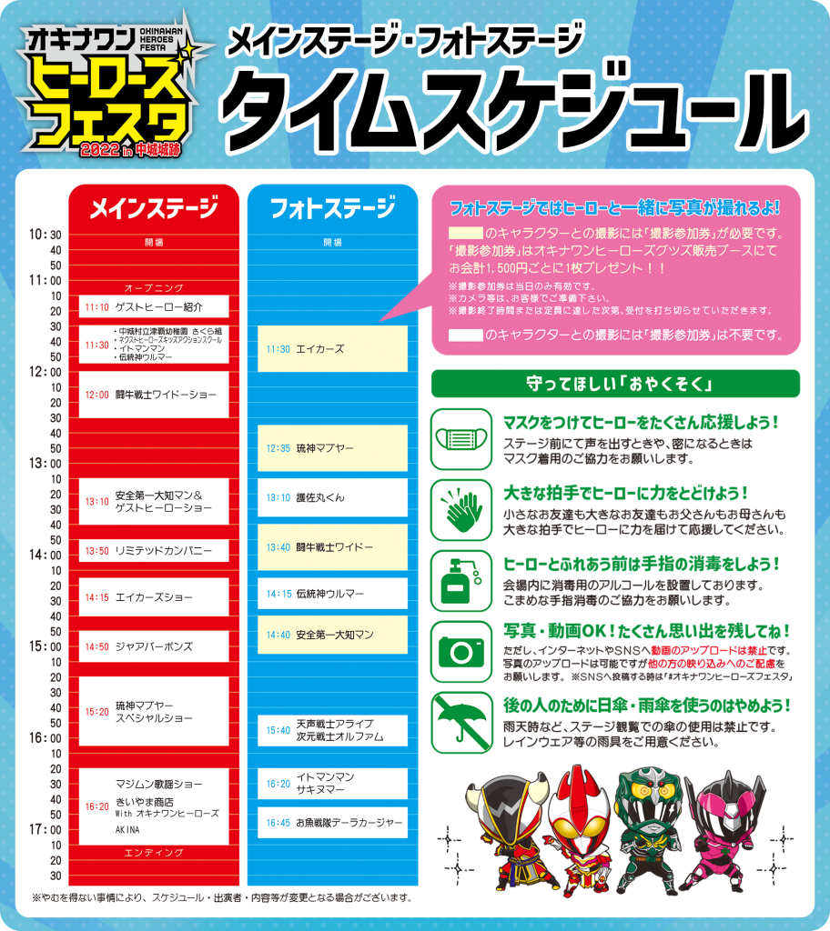 会場は、テレビドラマ「オキナワンヒーローズ」のロケ地である世界文化遺産・中城城跡で開催され、「琉神マブヤー」「闘牛戦士ワイドー」「エイカーズ」「安全第一大知マン」の4大ヒーローをはじめ、県内外のヒーローが登場するヒーローショーが行われるほか、ヒーローたちとのグリーティングおよび写真撮影会が行われます。プログラムのラストには、オキナワンヒーローズの主題歌に参加する「きいやま商店」やエンディング曲を歌う「AKINA」のスペシャルライブが実施されます。(4歳以下は参加無料、5歳以上は入場料1,000円)