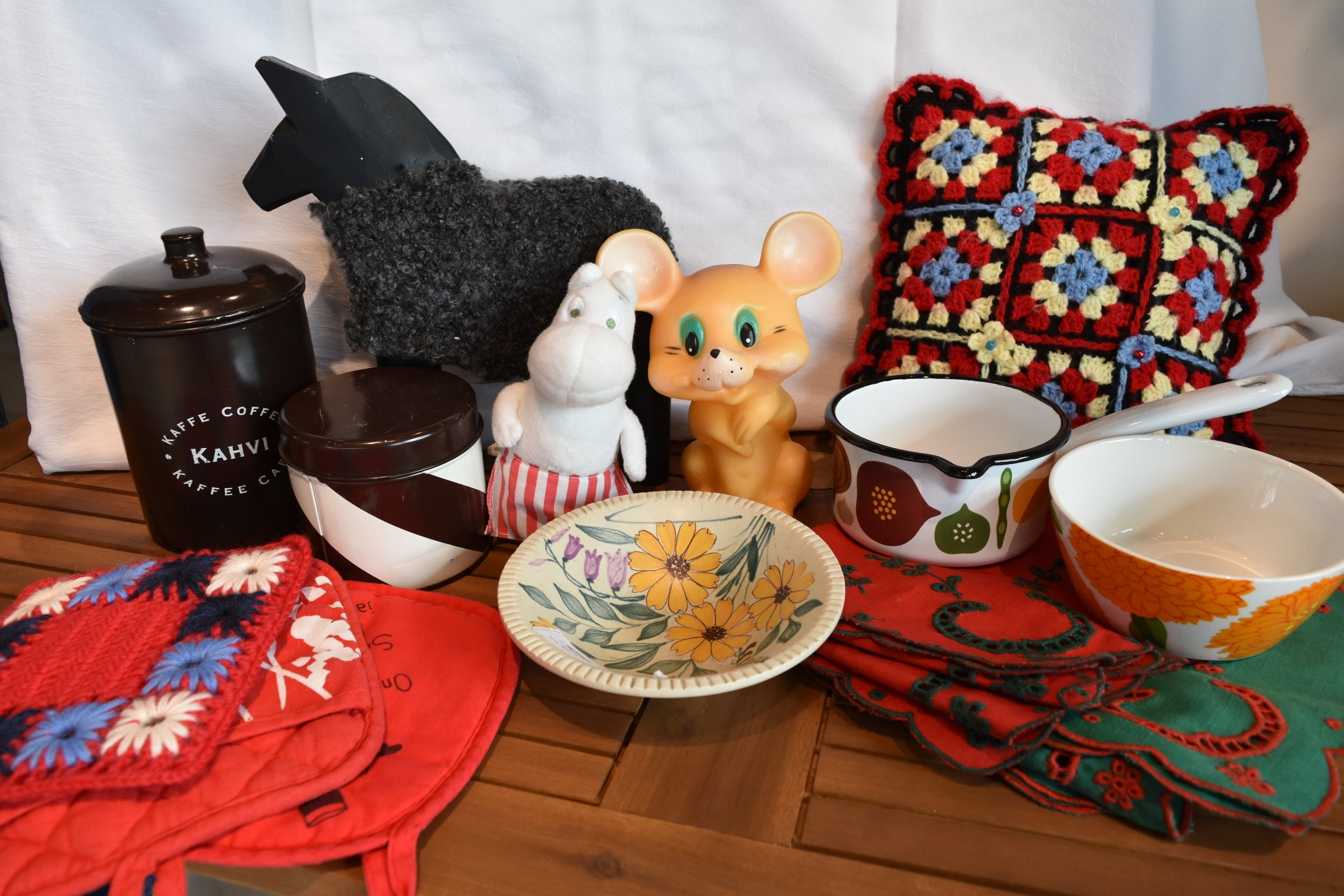 フィンランド現地の蚤の市で買い付けた商品が、Keitto Asua店内に並びます。ヴィンテージの器やインテリア雑貨、ファブリック、フィンランドの手作り雑貨など一点ものばかり♪