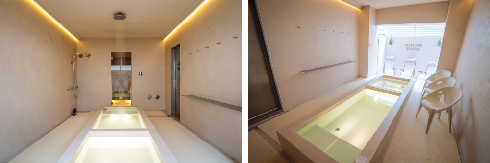 サウナから出て、すぐに冷水シャワー。そして目の前に水風呂。上がったその先には外気浴スペース。極限まで無駄を省き、心地よさを最大限に引き出す究極の導線を作り上げました。