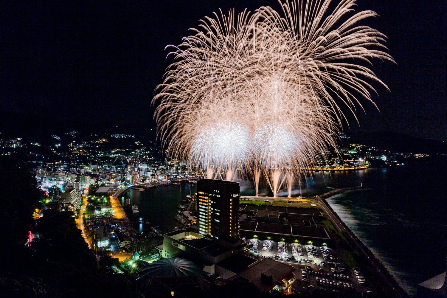 熱海海上花火大会は、1952年(昭和27年)にはじまった歴史ある花火大会。夏だけではなく年間を通して15回以上も開催されている熱海名物の花火大会です。夜空に広がる花火や、水面に映る花火、そして、フィナーレを飾る「大空中ナイアガラ」の美しさは、瞬きを忘れるほど!心にずっと残る思い出ができる、熱海海上花火大会ならではのイベントです。