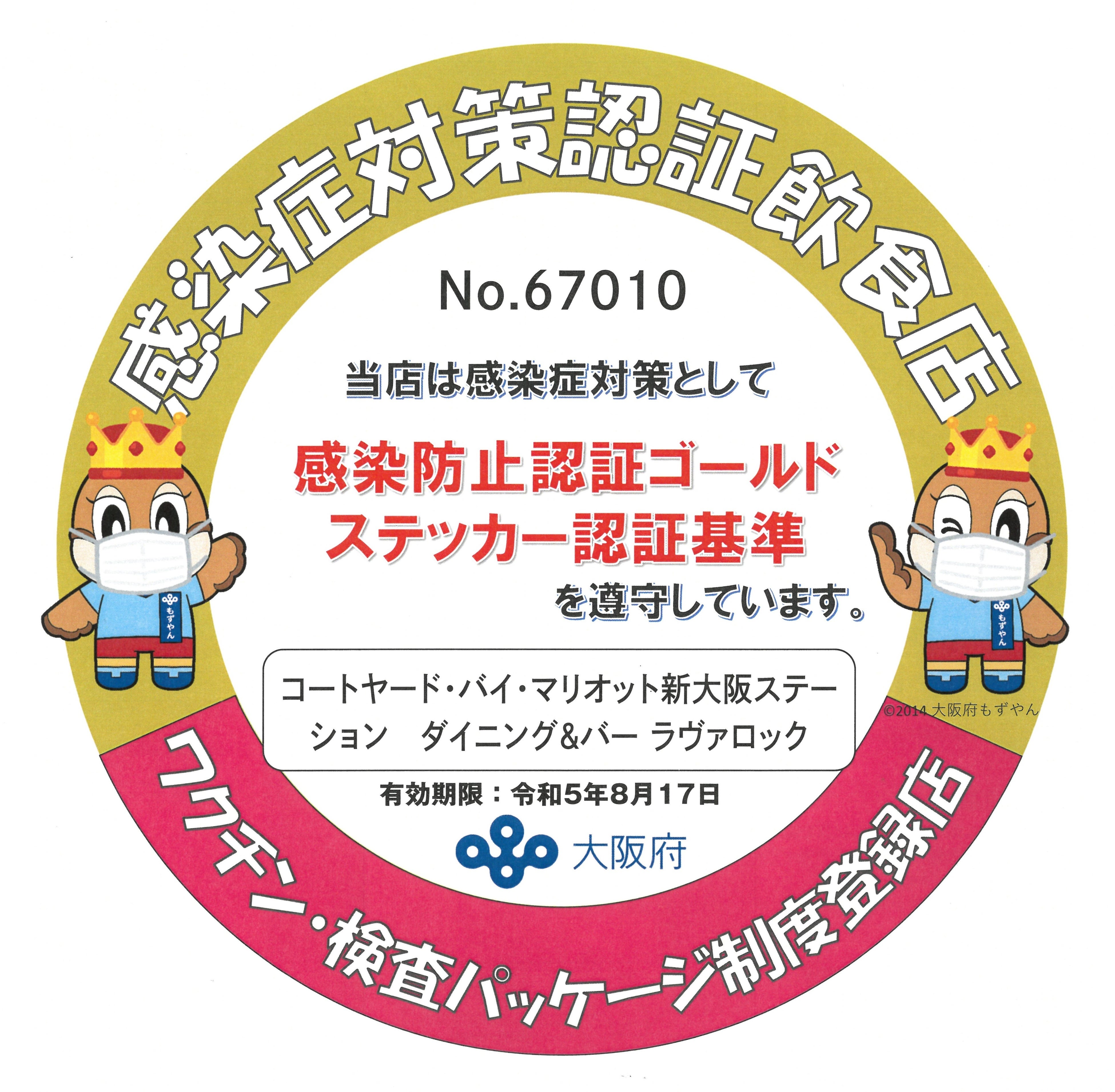 コートヤード・バイ・マリオット 新大阪ステーションでは、すべてのお客様の健康と安全を最優先に「三密回避」「徹底した衛生管理」「従業員の健康管理」に取り組む当社ガイドラインを遵守し、ホテル運営を行っております。レストラン&バーでは、大阪府が推奨する「感染に強い飲食店に向けて」の取り組みを実施し、「感染対策が取られているお店」としてのチェック項目をクリアいたしております。