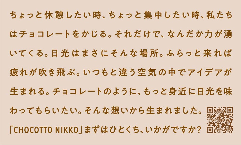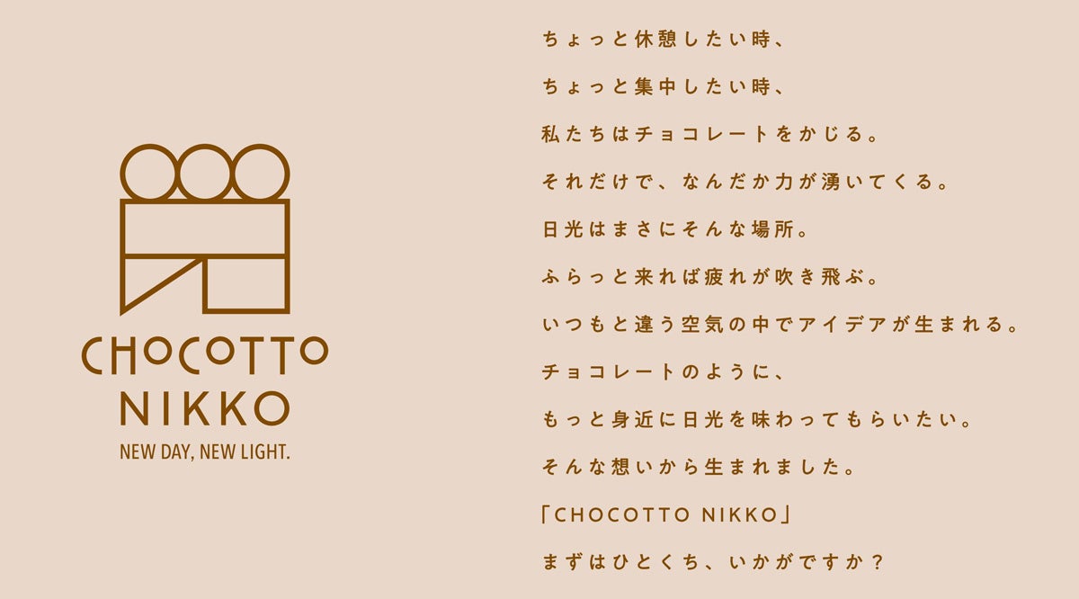 栃木県日光市(市長:粉川昭一)では現在、日光の様々な資源に新たな光をあてるブランディング「NEW DAY, NEW LIGHT. 日光」を展開しています。その活動の一環として、チョコレートを題材に日光独自の和魂洋才の魅力に新しい光を当て、チョコレートに関する商品等の情報発信によって、誘客促進と地域経済の活性化に繋げるプロジェクト「CHOCOTTO NIKKO」を来る11月29日(火)よりスタートいたします。