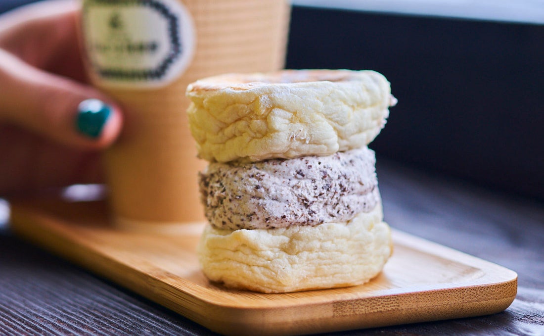 <特徴>濃厚チョコレートクリームとチョコチップを混ぜたホイップクリームをはさんだパンケーキサンド