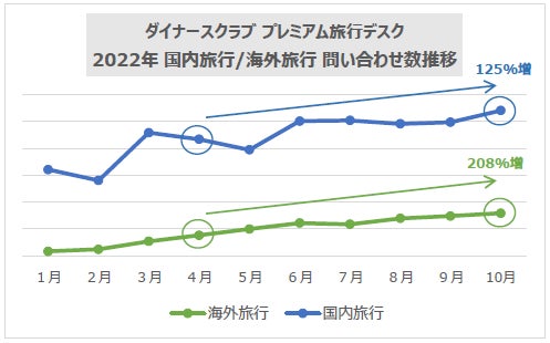 一方で海外旅行については、3月の「まん延防止等重点措置」解除直後には大幅な増加は見られなかったものの、各国の入国制限等の緩和に伴って徐々に問い合わせが増えている状況です。右のグラフのとおり、全体数はまだまだ国内旅行のほうが多いものの、今年の4月と10月の問い合わせ件数を比較すると、国内旅行の増加率が125%であるのに対し、海外旅行は208%増と高い上昇率となっています。
