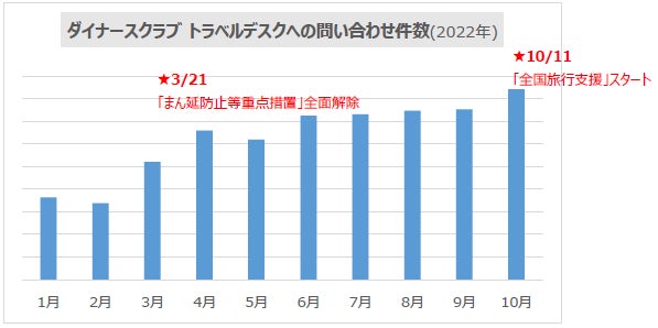 2022年1月~10月にダイナースクラブのトラベルデスクに入った旅行に関する問い合わせ件数の推移を見ると、まず3月21日に「まん延防止等重点措置」が全面解除となったことで、大幅に件数が増加しました。その後、5月に一度微減したものの、6月以降は毎月増加し続けており、多くの人が旅行に行くマインドになっていることを表す結果となっています。とくに「全国旅行支援」開始前後の9月~10月の合計問い合わせ数は、昨年同期間比で187%の件数となっており、制度を活用した旅行ニーズがますます高まっていることが見て取れます。