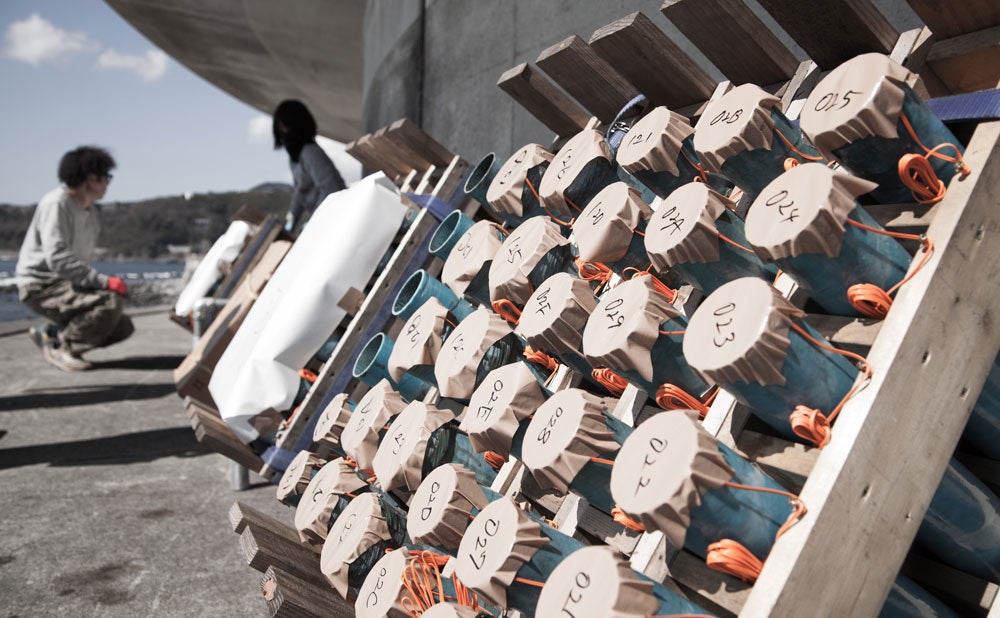 花火装鎮済の筒には、防焔紙(ぼうえんし)という、特殊加工されたオリジナルシートを被せています。防炎性能に加え、防水効果もあるため、花火大会の当日に、多少の雨天でも打上げが可能です。