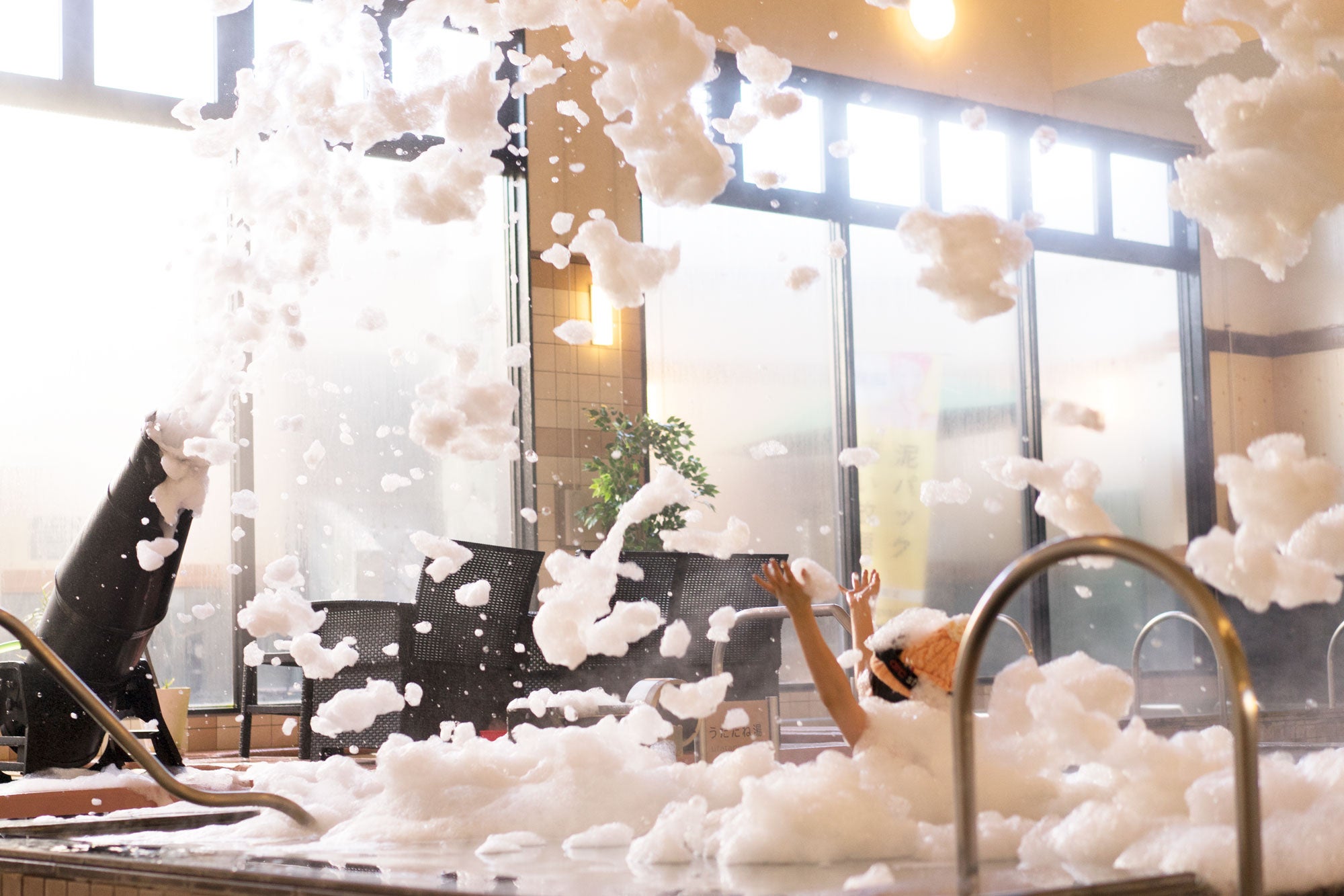 「泡パーティー」は女性浴室で毎週土日祝14:30に開催。雪のように降り注ぐ大量の泡を全身で浴びる非日常な体験を!