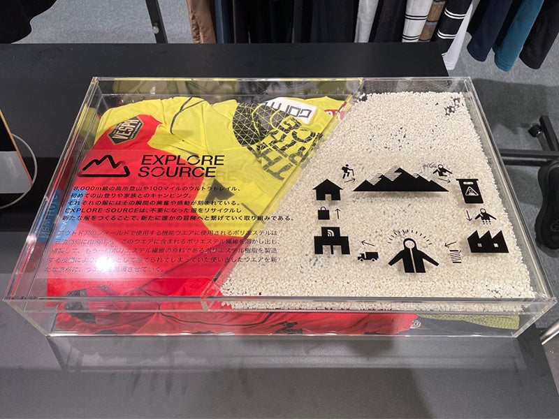 THE NORTH FACEでは、「EXPLORE SOURCE(エクスプロールソース)」という、独自のウェアリサイクルの循環型アップサイクルプロジェクトを行っています。これは、THE NORTH FACE直営店のリサイクルボックス設置店舗で顧客から冒険を終えた(不用になった)アパレル製品を回収し、そこからタフさを要求されるアウトドアフィールドでも十分に機能が発揮できる純度の高いポリエステル素材を再生成し、よりハイスペックな製品へアップサイクルして次の冒険へつないでいくという、ユーザーと共に循環のサイクルを生み出していくというストーリーを持った取り組みです。