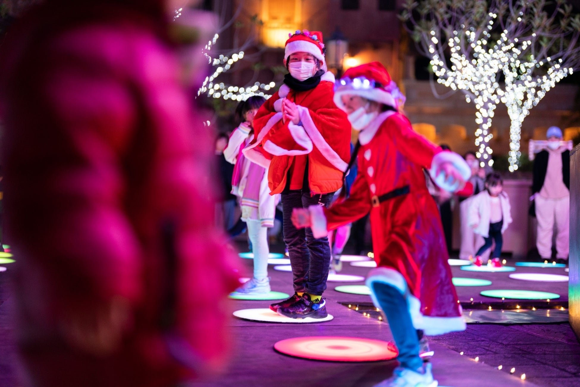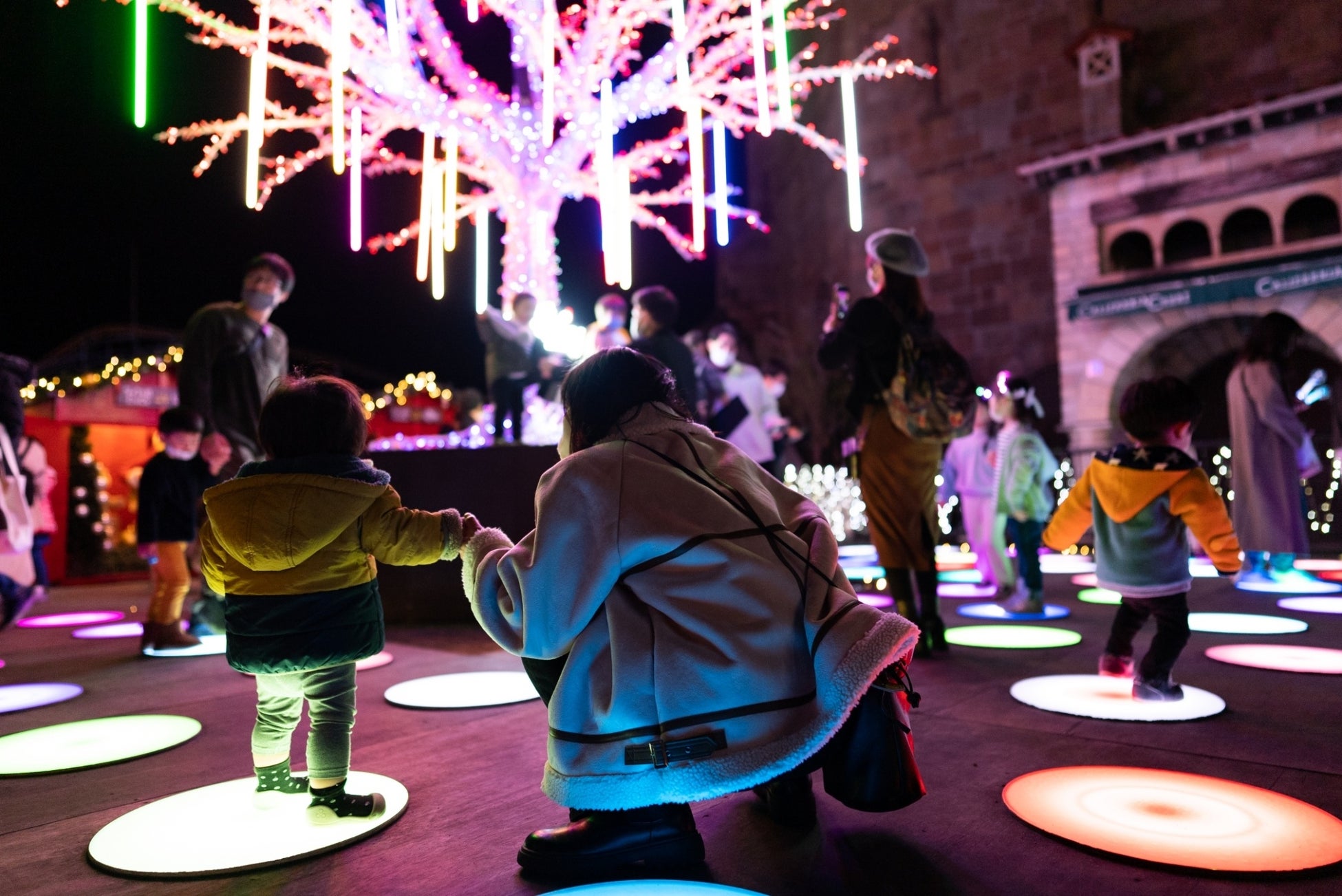 真っ赤なイルミネーションゲートをくぐりぬけるとそこはクリスマスキッズパーク! タップするといろいろな色に変わる不思議なステージ「Lighting Tap Dance」やサンタクロースが住むキッズサイズのヒュッテ(木の小屋)ではおもちゃで遊ぶことができます。さまざまな色に光り輝くフェスタ・ルーチェのシンボルツリー「SymbolicTree」の下でおもいっきり遊ぼう!!